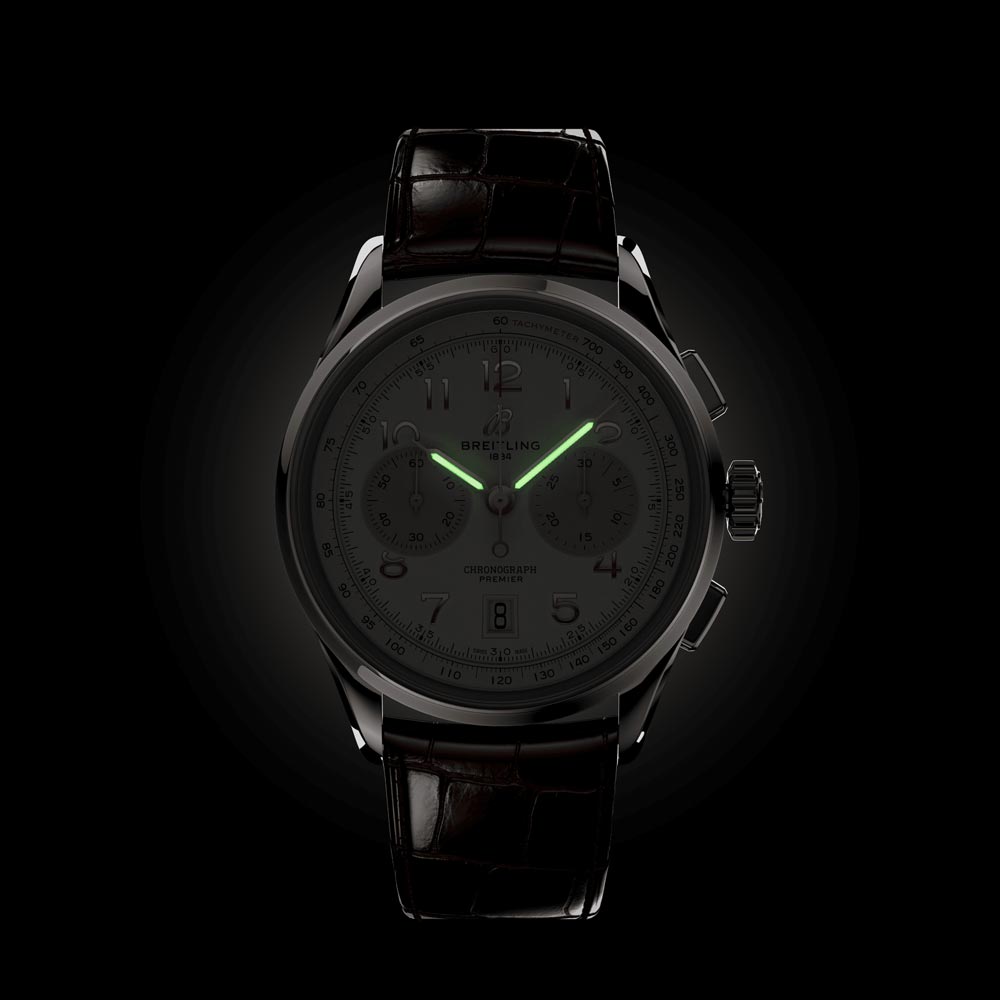 This regal Premier chronograph features a 42mm stainless steel case presented on a distinguished blue crocodile leather strap. Its deep blue dial is accentuated by striking black 30-minute and 12-hour chronograph counters. View the self-winding high-precision chronometer-certified chronograph calibre. Breitling Manufacture Calibre 01. through the transparent sapphire caseback. Five-year warranty included. Opt for a brown nubuck leather strap or a classic seven-row stainless steel bracelet for varying looks. A perfect amalgam of elegance and performance define the Breitling Premier name.