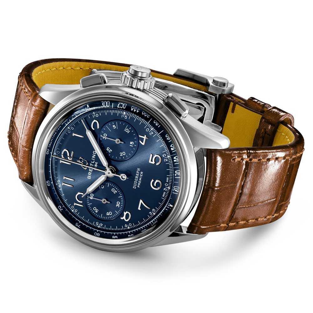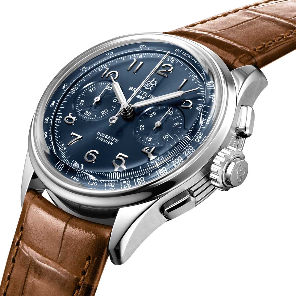Featuring chonograph pushers forming a rectangular shape. a bi-compax chronograph look and Arabic numeral markers. the Breitling Premier Chronographs feature intricate details like the grooves of the case-sides. a transparent sapphire caseback. and inspired vintage hands. The Duograph is obtainable in two compositions: stainless steel and a blue dial or 18ct red gold and a black dial. joined with a leather strap in either gold brown or black.