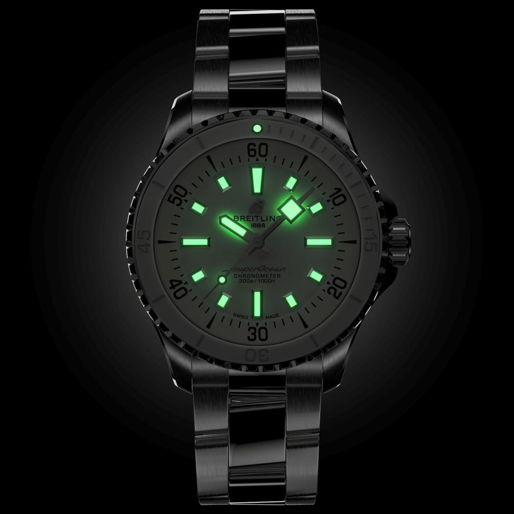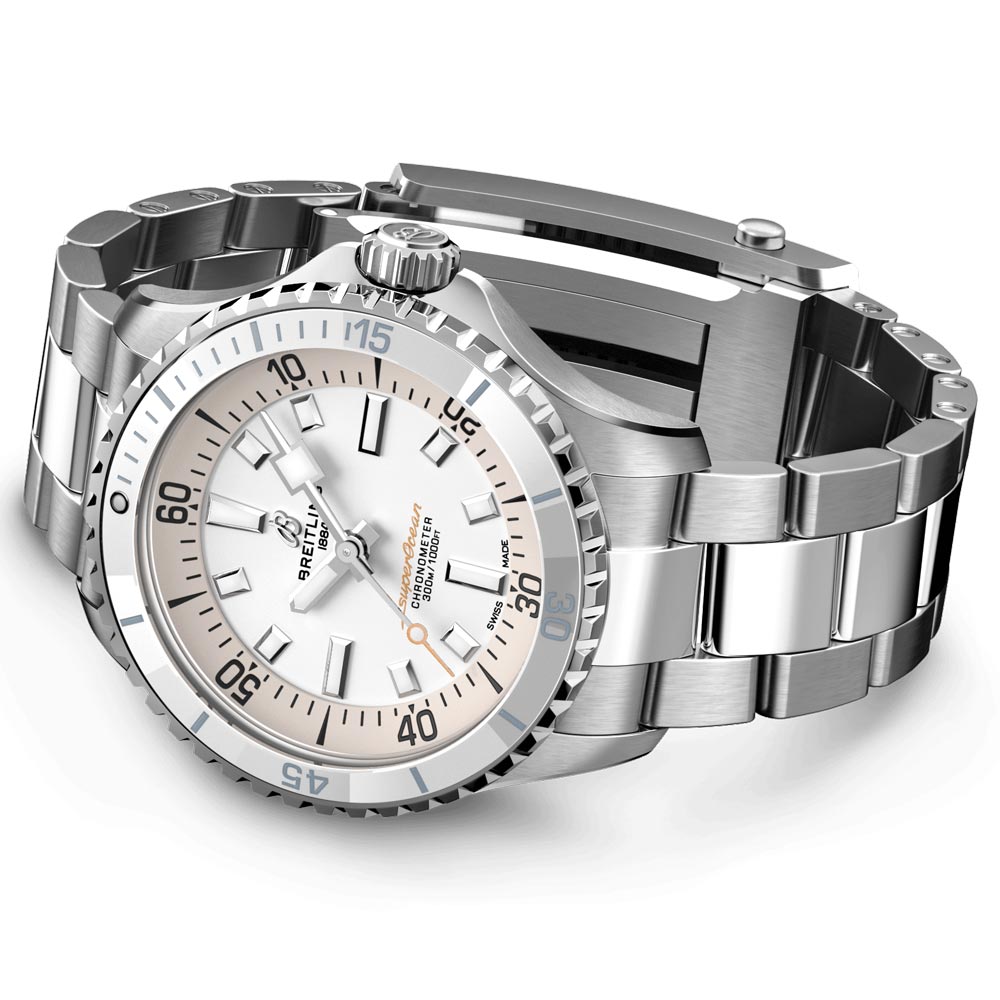 This Breitling Superocean 36mm White Dial Automatic Ladies watch celebrates the style of the 60s-era Slow Motion watch. It features a ceramic-inlayed bezel. bright dials. broad luminescent hands/indexes for readability underwater. and is water resistant to 300 m (1000 ft). It's also shock-. sand- and saltwater-resistant. ideal for all your water-based activities. A timeless classic in both performance and style.