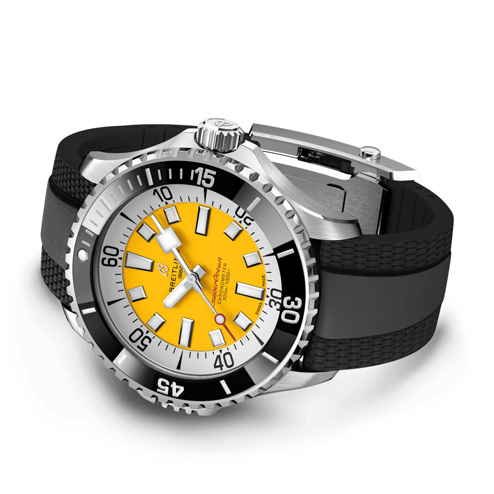 The Breitling Superocean gents watch. with its yellow dial and 46mm size. combines both high performance and stylish design for all aquatic activities. During the scuba diving craze of the 1960s. Breitling focused on creating a dive watch that prioritized timing and essential features for lifesaving. The result was the Slow Motion. a streamlined watch with clear lines. luminescent indexes. squared-off hands. and a high-contrast dial ring for optimal legibility. While its practicality was appreciated. it was the watch's sleek appearance that truly captured people's hearts.