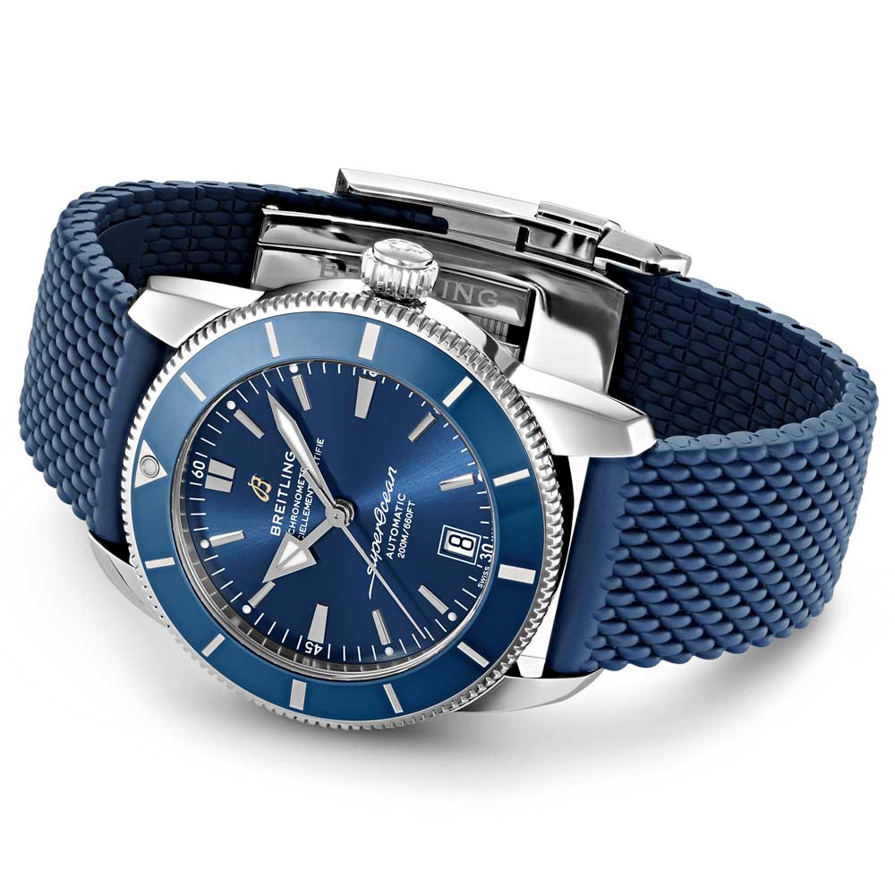 This Breitling Superocean Heritage B20 Automatic watch is available in stainless steel and 18ct red gold. The face options include black. blue. and green dials. and the watch can be paired with a matching mesh bracelet or a rubber strap with a folding buckle. The timepiece operates using the COSC-certified Breitling Manufacture Calibre B20. which is based off of the Tudor Calibre MT5612.