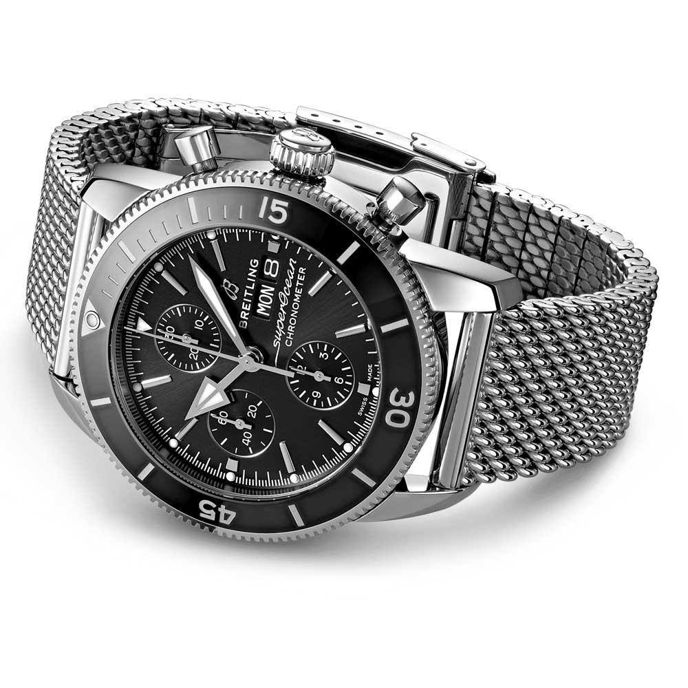 Blending a classic aesthetic with contemporary features. the Gents Superocean Heritage II Chronograph Watch combines 1950s-era Superocean design with modern details. This timepiece showcases a unique combination of triangle hands and a unidirectional bezel with a polished ceramic ring. encapsulating the spirit of the sea. Available in stainless steel and 18ct red gold. with a variety of colourful dials. it comes with either a mesh bracelet or a “mesh-styled�?rubber strap with a folding buckle. Powered by Breitling Calibre 13-- a COSC-certified chronometer-- the Superocean Heritage is ideal for both land and water activities.