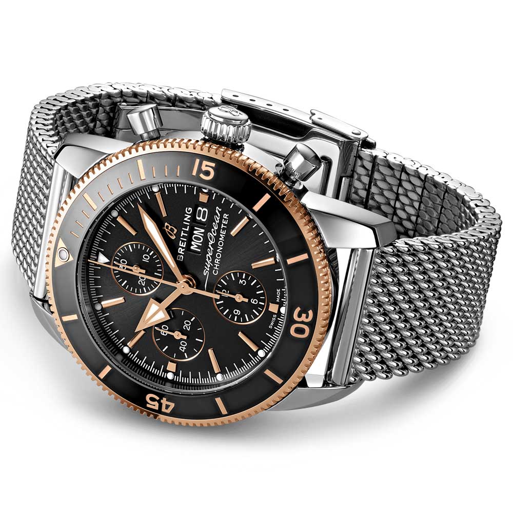 The Superocean Héritage II Chronograph 44. powered by Breitling's Calibre 13 automatic movement. shows off a notably athletic look. thanks to its 6. 9. and 12 o'clock sub-dials. It's offered in two stainless steel versions. plus one crafted with steel and 18ct rose gold -- a stark black dial model that comes mounted on an Ocean Classic steel bracelet.