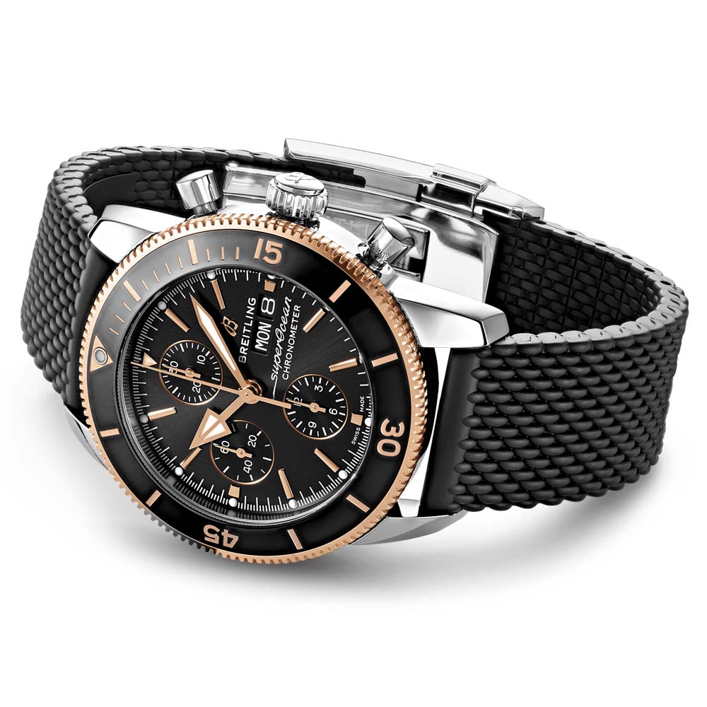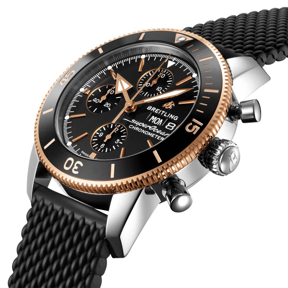 The Superocean Heritage exhibits a unique combination of iconic design features from the 1950s and contemporary touches. Boasting a sporty yet elegant look. this diver's watch flaunts a unidirectional bezel adorned with a polished ceramic ring and iconic triangular hands. It is offered in multiple materials - such as stainless steel and 18k rose gold - with a varied selection of dials. Accompanied by either a mesh bracelet or an “mesh-styled�?rubber strap with a folding buckle. the watch is powered by the Breitling Caliber 13. a COSC-certified chronometer.