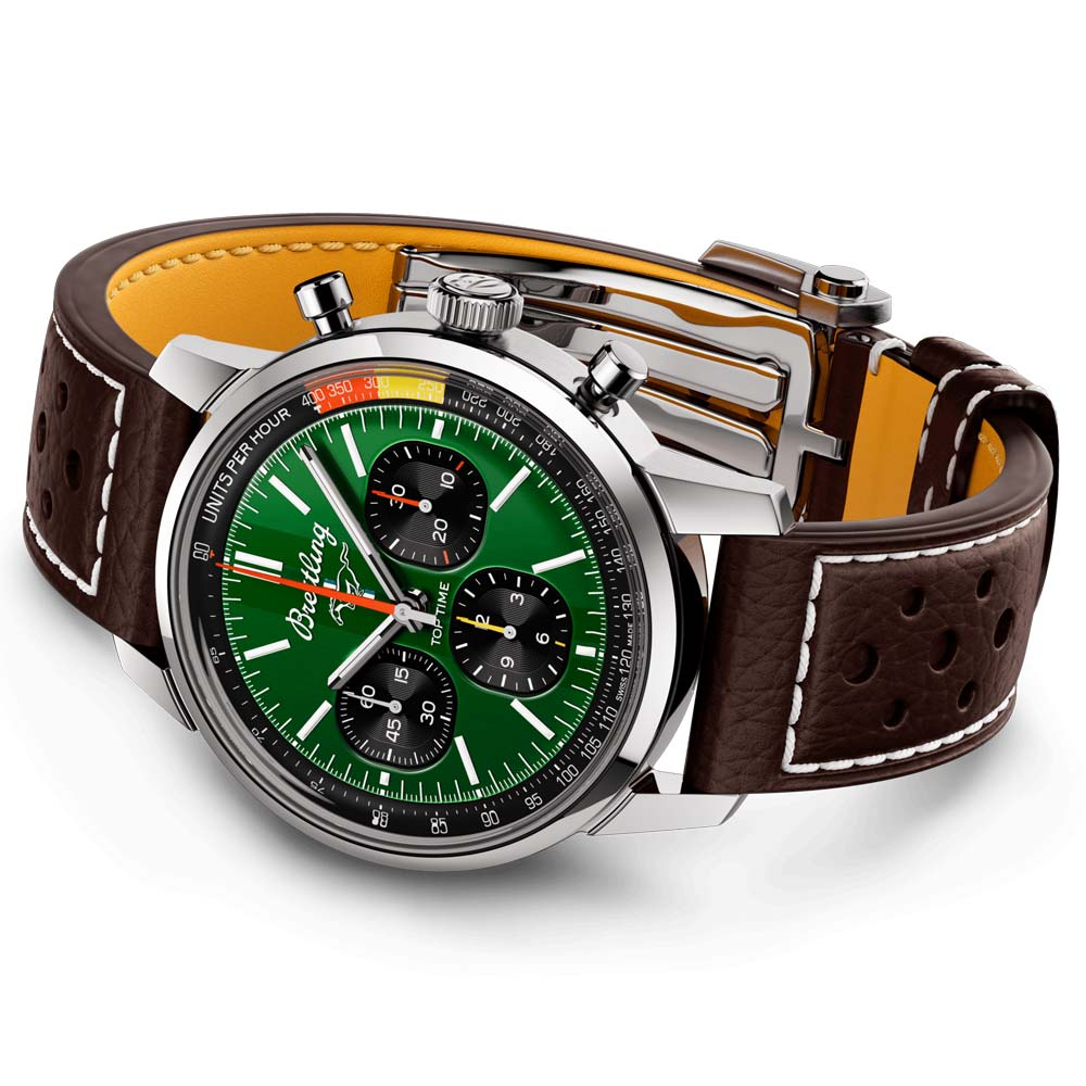 The Top Time B01 Ford Mustang showcases the iconic colors and logo of the classic car. with a perforated leather strap. tachymeter scale and unique "squircle" subdials modeled after vintage dashboard gauges. It is powered by Breitling's exceptional Calibre 01 engine.