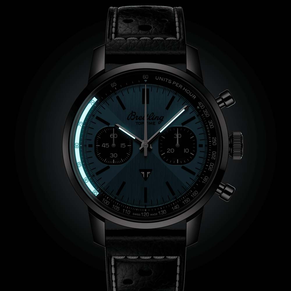 This collaboration with British motorcycle brand Triumph features an ice-blue dial. precisely color-matched to a 1951 Triumph Thunderbird 6T and a rare blue-dialed Breitling Top Time Ref. 815 from the '70s. Collectors can also spot vintage Breitling logos. mushroom chronograph pushers and "Zorro" dial designs. Plus. Top Time's iconic bowtie motif - a nod to the swashbuckler's mask - is added via metal brushing for a radiant textured effect.