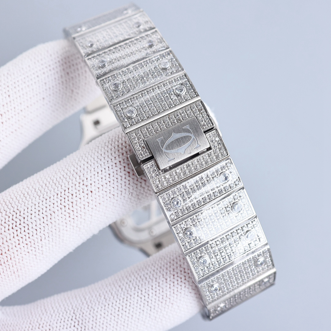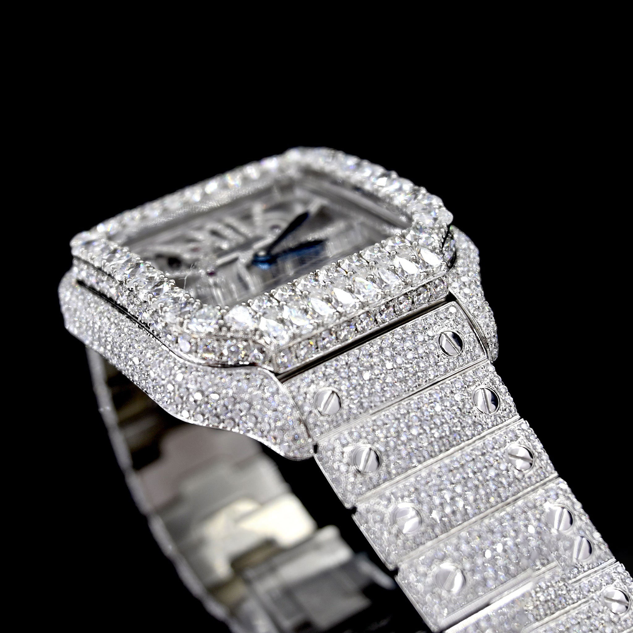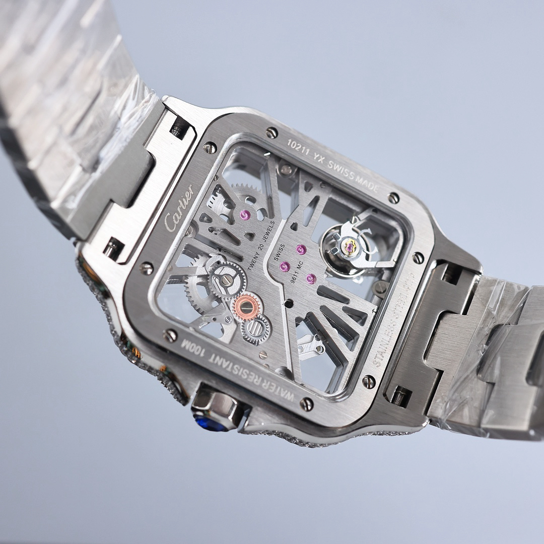 • Cartier Santos De Cartier Skeleton Hand Wound Movement Custom Pave Diamond ICED OUT