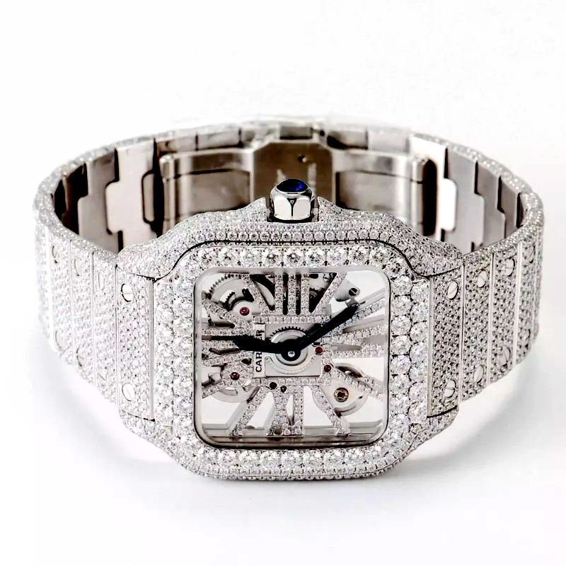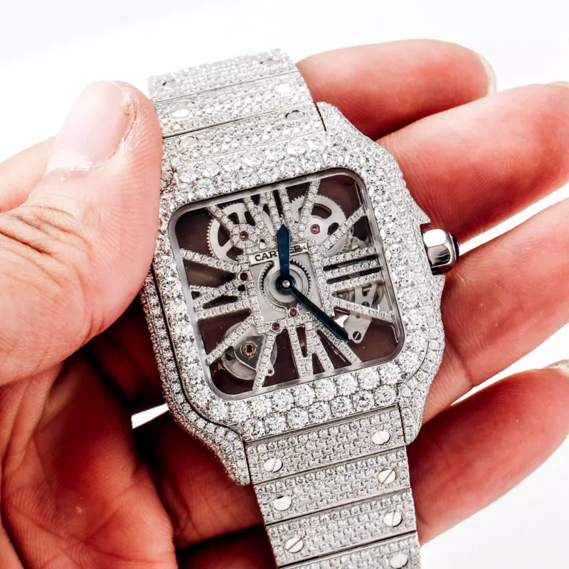 We use Rhinestone or Zircon for our iced out watches, and all our diamond watches feature high-quality movement with a super clone standard. If you prefer real moissanite, the watch will cost $3000-4000 and will pass testing with cert.