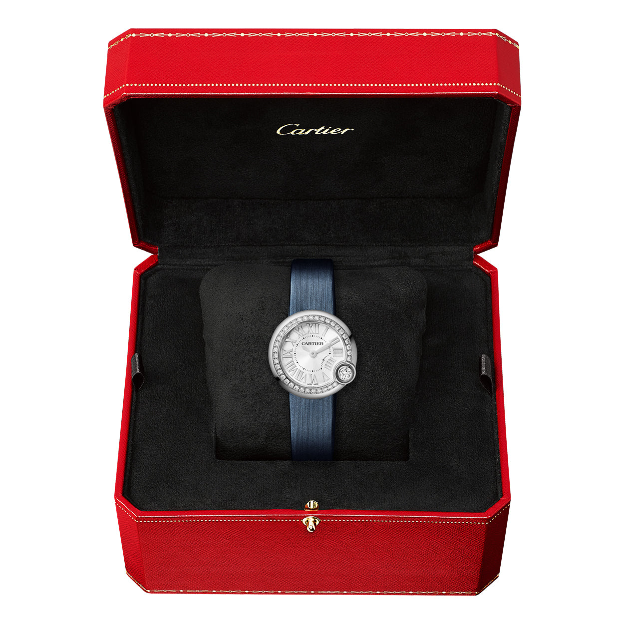 Cartier Ballon Blanc de Cartier 26mm Diamond Set Bezel Watch WJBL0002. Stainless steel 26mm case & diamond set bezel (0.56t) all on a blue satin strap. This ladies watch has a silvered sunray dial with polished hands and polished roman numerals. Water resistant up to 30m and sapphire crystal glass. Quartz movement.