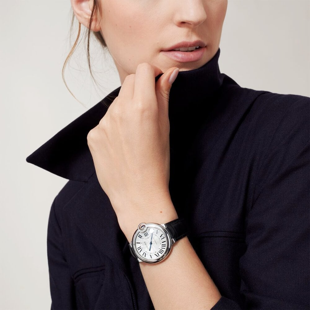 The Ballon Bleu watch collection by Cartier is characterised by its bubble-shaped case inspired by a floating balloon and its blue spinel-adorned crown incorporated into the shape and structure of the case itself. This elegant 36mm Cartier Ballon Bleu watch is crafted from stainless steel and comes fitted on a classic-looking black alligator leather strap with an interchangeable stainless steel folding buckle. The 30-meter water resistant model represents the time on a silvered guilloche opaline dial with crisp black Roman numeral hour markers. an inner minute track and the famous Cartier lettering at the centre of the dial. Blued steel hands are shaped into a sword profile and the entire display is protected by a lens of anti reflective sapphire crystal glass. To promise uncompromised reliability and precision. this Ballon Bleu de Cartier watch is powered by a mechanical Cartier movement. complete with traditional decoration and hand-assembled parts that work harmoniously together for a smooth performance.