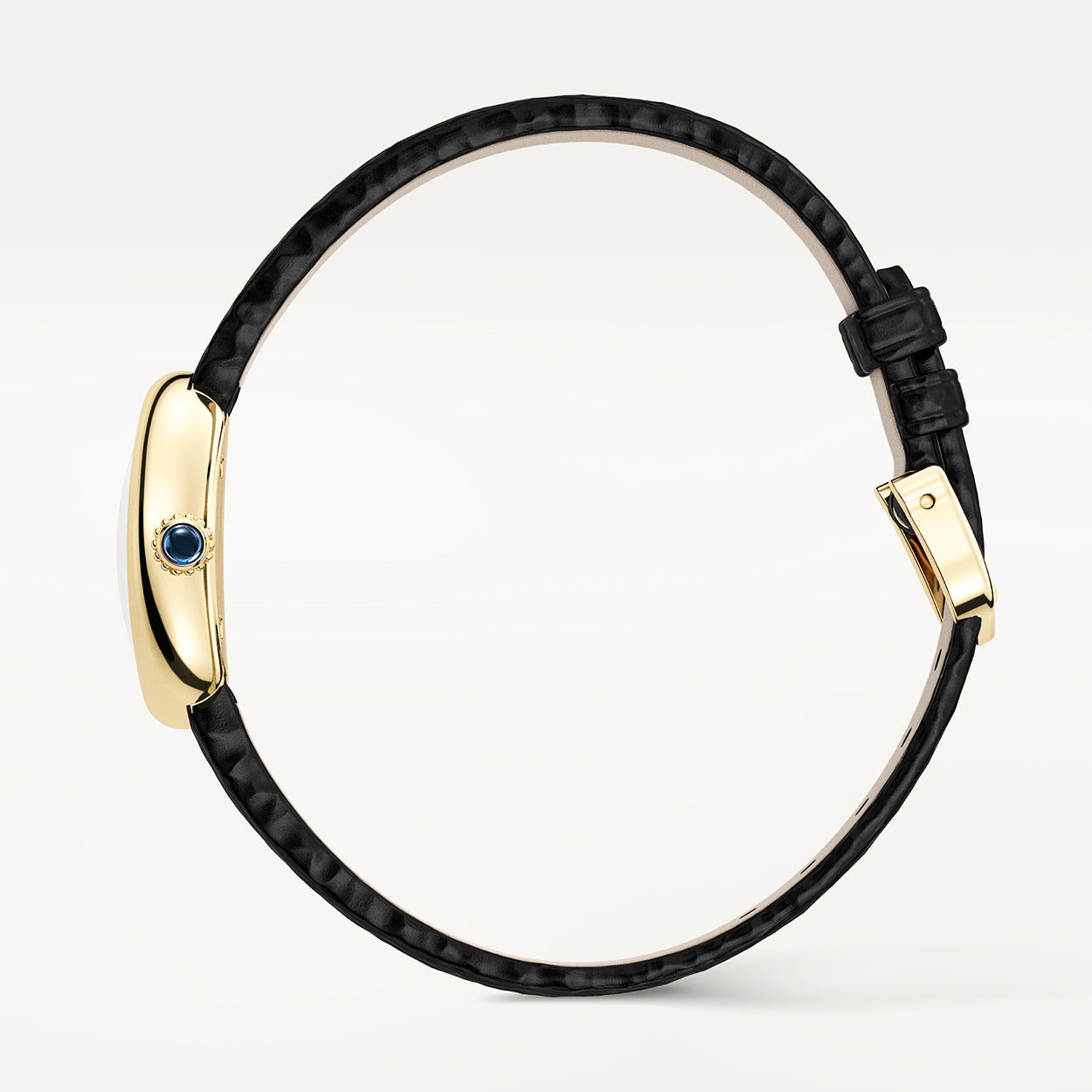 18ct yellow gold 18.7mm x 24.6mm case and bezel all on a black leather strap. This Cartier Baignoire ladies watch has a silvered dial with black roman numerals and blued steel hands. Water resistant up to 30m and sapphire crystal glass. Quartz movement.