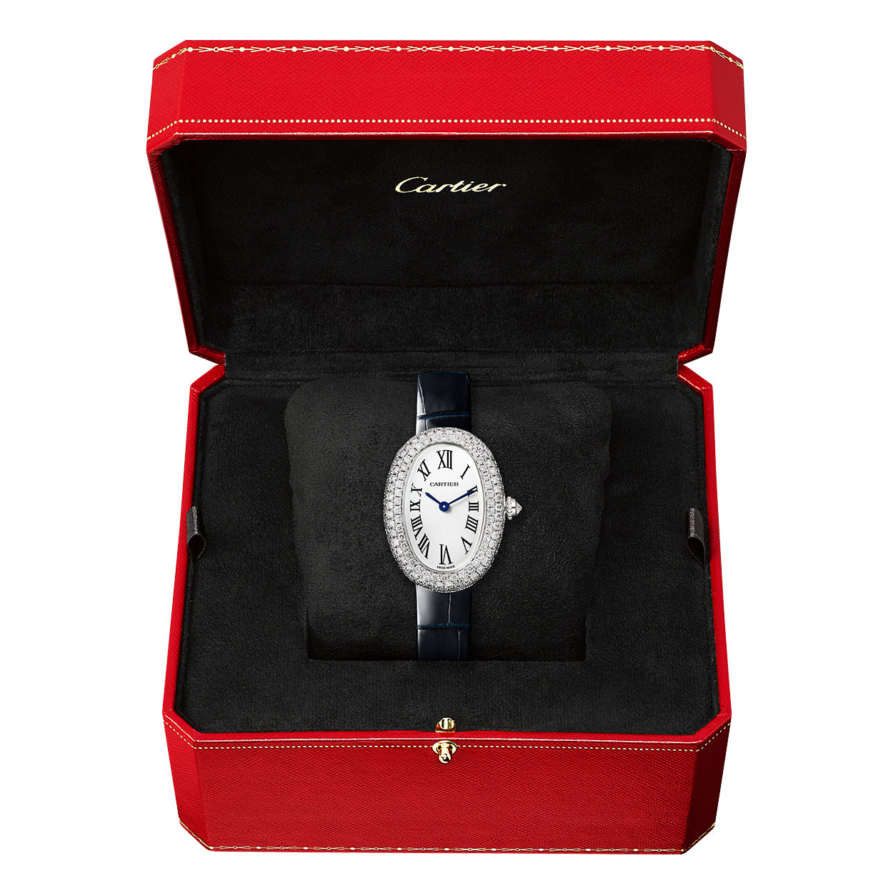 Cartier Baignoire Small 18ct White Gold Diamond Set Ladies Strap Watch WJBA0015. 18ct rose gold 31.4mm x 23.1mm case and two-row diamond set bezel all on a blue alligator leather strap. This ladies watch has a silvered dial with blued steel hands. Water resistant up to 30m and sapphire crystal glass. Quartz movement.