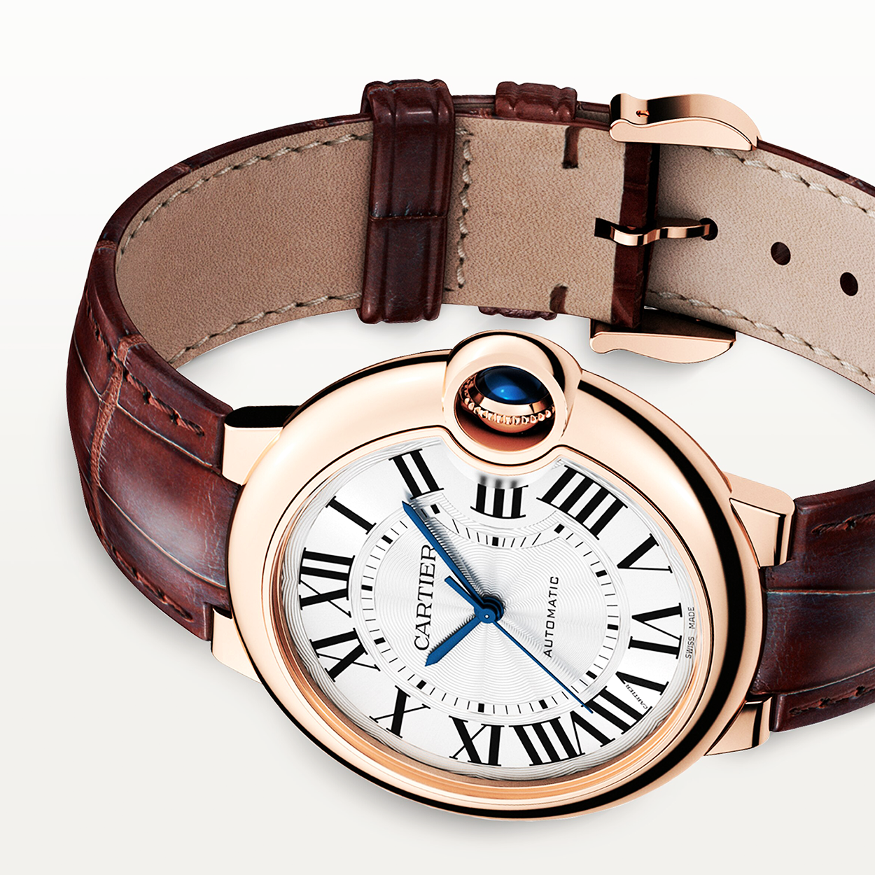 Cartier Ballon Bleu 18ct Rose Gold 36mm Automatic Leather Strap Watch WGBB0009. 18ct rose gold 36mm case and bezel all on a brown alligator leather strap. This watch has a silvered guilloche dial with blued steel hands and black roman numerals. date display at the 3 o'clock position. Water resistant up to 30m and sapphire crystal glass. Automatic movement.