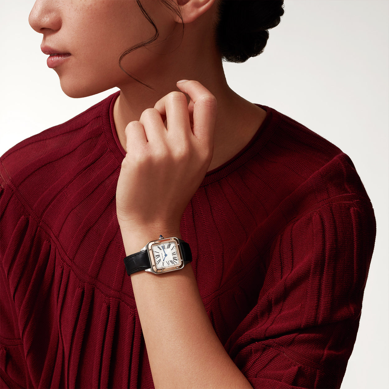 This small-sized Cartier Santos Dumont watch bears dimensions of 38 mm x 27.5 mm and Features a stainless steel case adorned with an 18ct rose gold bezel. A silvered satin-brushed dial is pierced with crisp black traditional Roman numeral hour markers and a set of sword-shaped central hands crafted from shimmering blued steel. Additional Features on the dial are the Cartier brand lettering and a discreet minute track running around the outer edge of the watch face. This small Cartier Santos Dumont watch is powered by an impeccable quartz movement. nestled inside a 30 meter water resistant case with a sealed caseback. The lady's Cartier watch is completed with a sapphire glass front and secures to the wrist with a comfortable and classic black alligator leather strap and steel buckle for wearing with smart and relaxed attire.