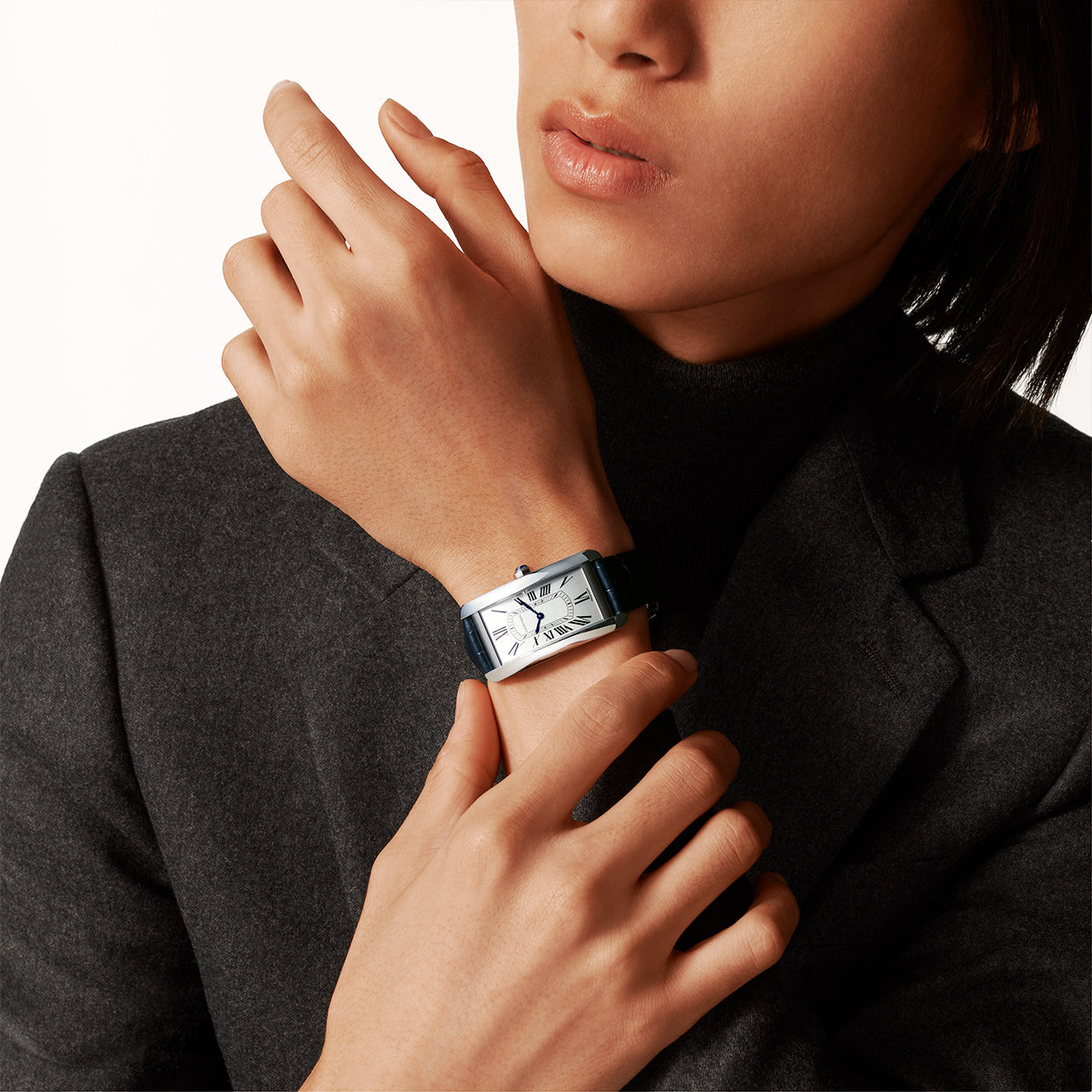 Cartier Tank Americaine Large Steel Leather Strap Watch WSTA0083. Stainless steel 44.4mm x 24.4mm case and bezel all on a blue leather strap. This men's watch has a silver sunray dial with blued steel hands and black roman numerals. Water resistant up to 30m and sapphire crystal glass. Automatic movement.