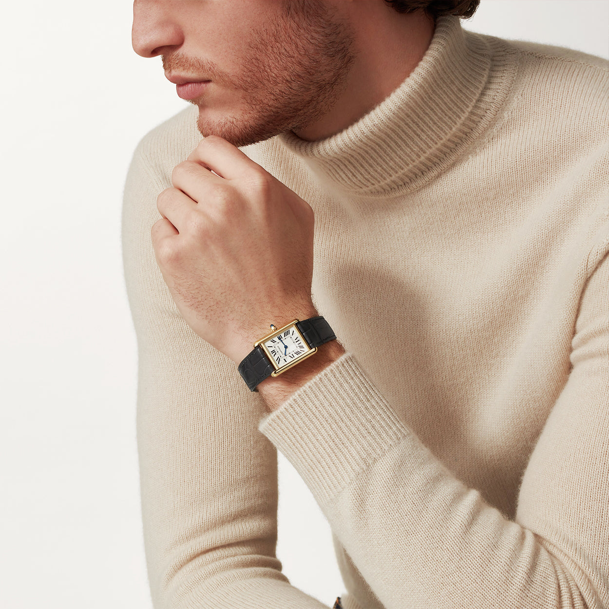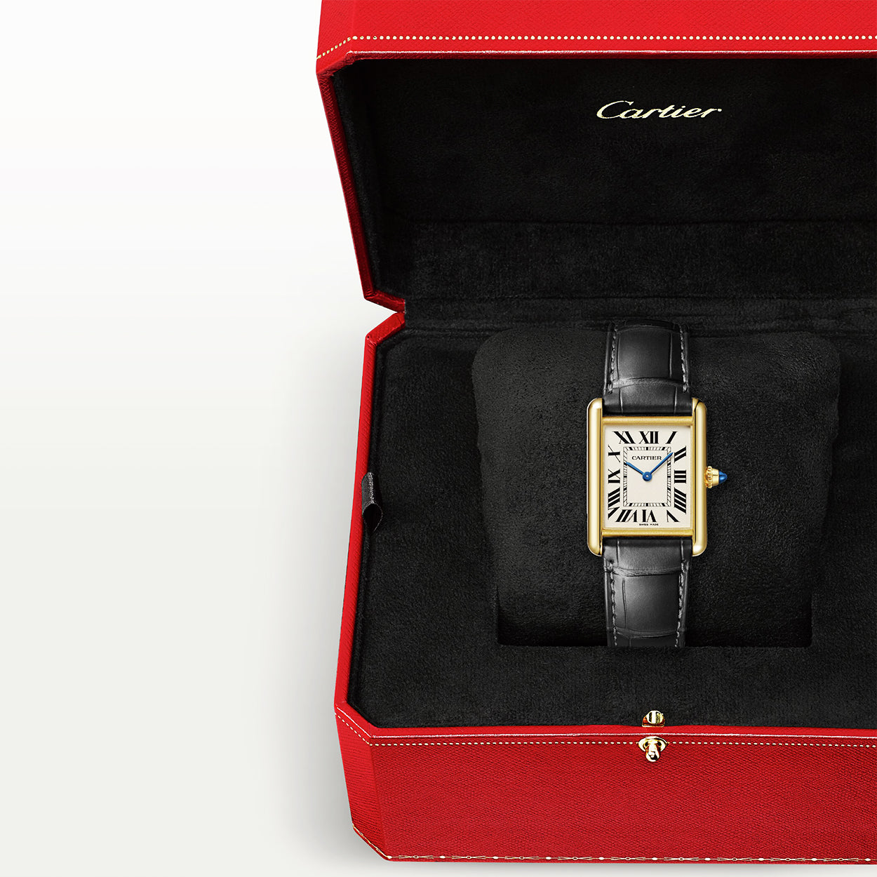 Cartier Tank Louis Cartier 18ct Yellow Gold Large Model Leather Strap Watch WGTA0067. 18ct yellow gold 25.5mm case and bezel all on a black alligator leather strap. This watch has a silvered dial with black roman numerals and blued steel hands. Water resistant up to 30m and sapphire crystal glass. Quartz movement.