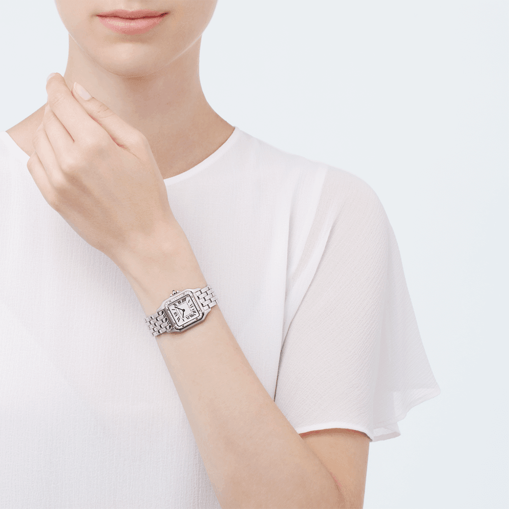 This elegant Panthere de Cartier watch is crafted from stainless steel and bears dimensions of 27mm x 37mm. The case is also integrated with 30-meter water resistant technology and protects a quartz-powered movement at its centre. Some of the most admirable Features of this lady's Panthere de Cartier watch include its silver dial with blued steel central hands and a highly legible black Roman numeral hour track with an inner minute trail. Sparkling diamonds have been set into the iconic square shape of this watch's bezel. and a synthetic blue spinel also adds a glamorous finish to this timepiece. Panthere de Cartier watches have been gracing elegant women's wrists since 1983 and create a sophisticated. feline and ultra-feminine look when paired with best attire. The watch is finished on a detailed stainless steel link bracelet. securing with a comfortable folding clasp.