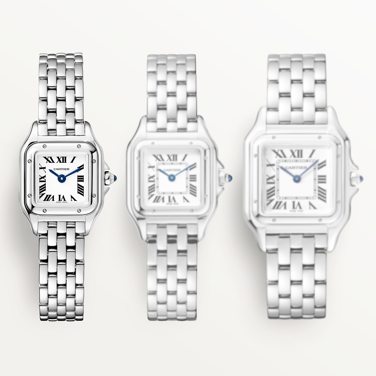 One of the most distinctive watch designs by Cartier is the Panther. This elegant lady's Mini Steel Panthere de Cartier watch Features the iconic square-shaped case that became so popular when it first launched in the 1980s. Ensuring the lady gets noticed. this Cartier Panthere watch Features a silver dial adorned with crisp black Roman numerals styled traditionally around the hour track and a set of blued steel central hands. The octagonal crown set to the side of the Panthere watch's case is adorned with a blue synthetic spinel. while inside the watch's 30-meter water resistant stainless steel case lies a Swiss-made quartz movement for uncompromised reliability. The entire dial of this lady's Cartier Panthere watch is protected by a sapphire glass lens integrated with the brand's anti reflective and scratch resistant technology. The timepiece is completed on a polished stainless steel bracelet which secures to the wrist with a refined folding clasp.