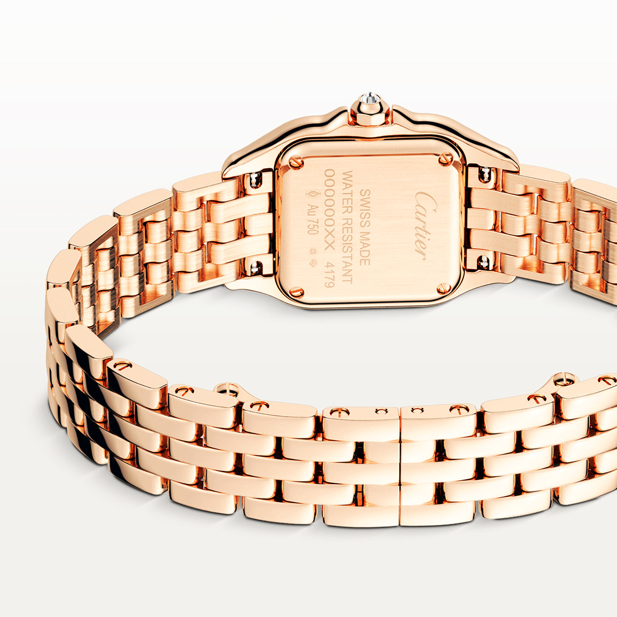 Cartier Panthere de Cartier Small 18ct Rose Gold Plum Dial Diamond Set Watch WJPN0035. 18ct rose gold 22mm x 30mm case and diamond set bezel all on an 18ct rose gold bracelet. This ladies watch has a plum sunray dial with golden hands. Water resistant up to 30m and sapphire crystal glass. Quartz movement.