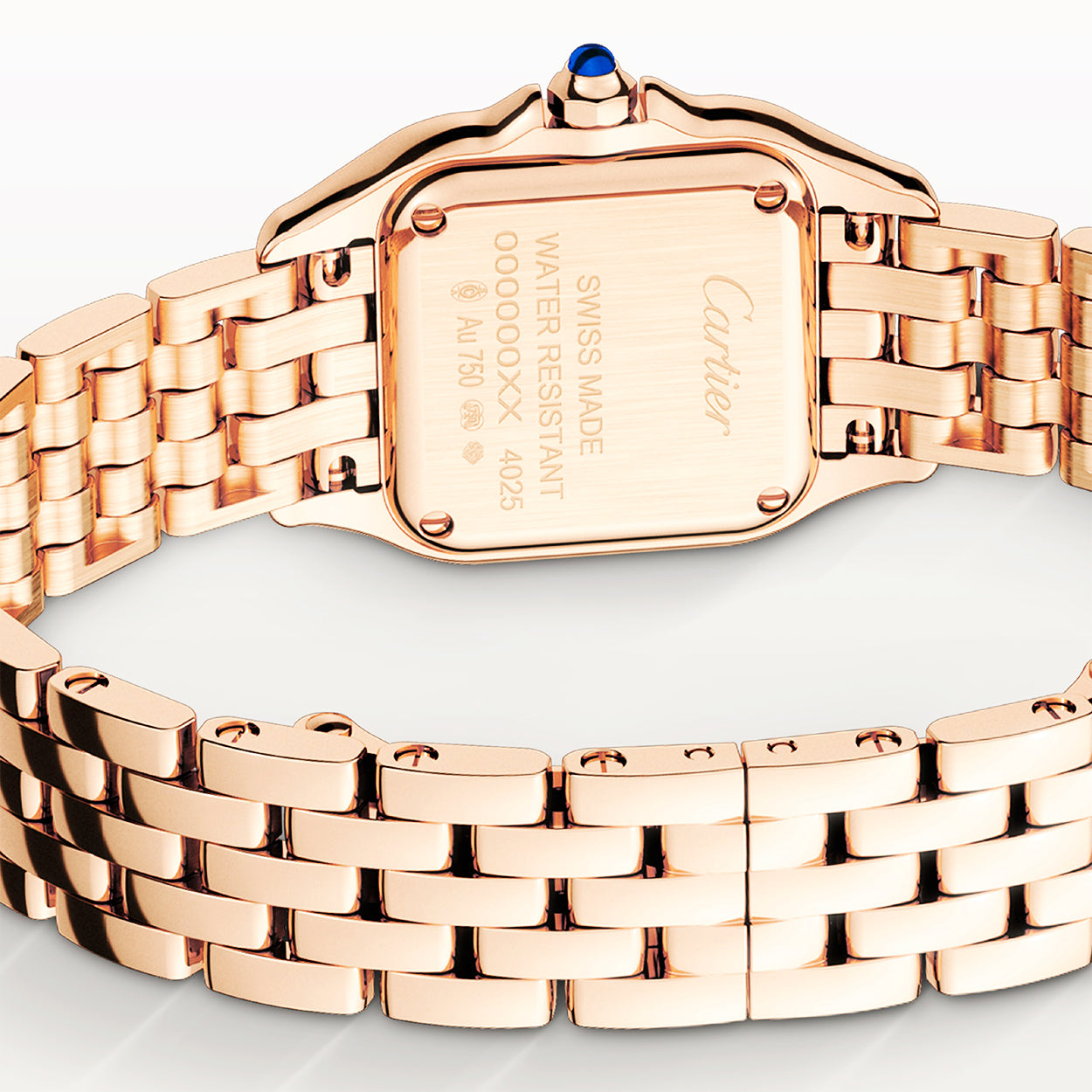 Cartier Panthere de Cartier Small 18ct Rose Gold Ladies Watch WGPN0040. 18ct rose gold 23mm x 30mm case and bezel all on a matching 18ct rose gold bracelet. This ladies watch has a white dial with black roman numerals and blued steel hands. Water resistant up to 30m and sapphire crystal glass. Quartz movement.