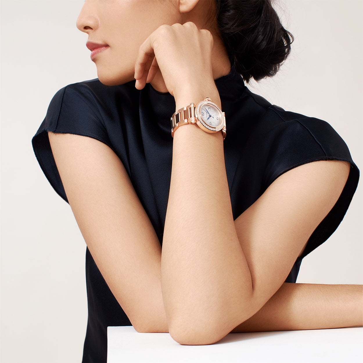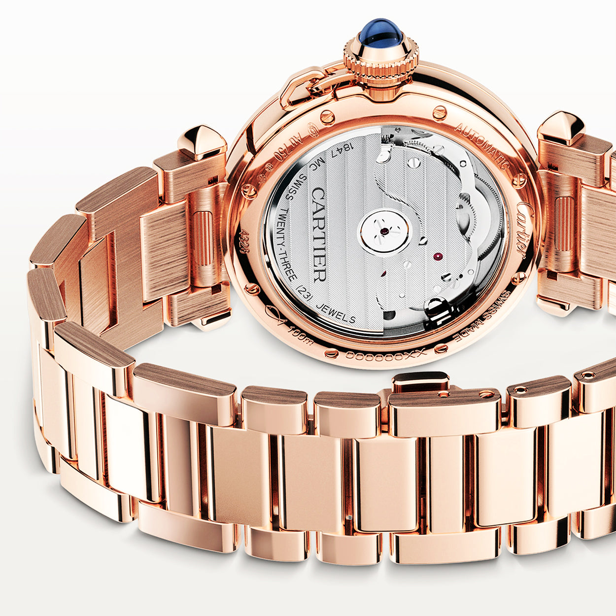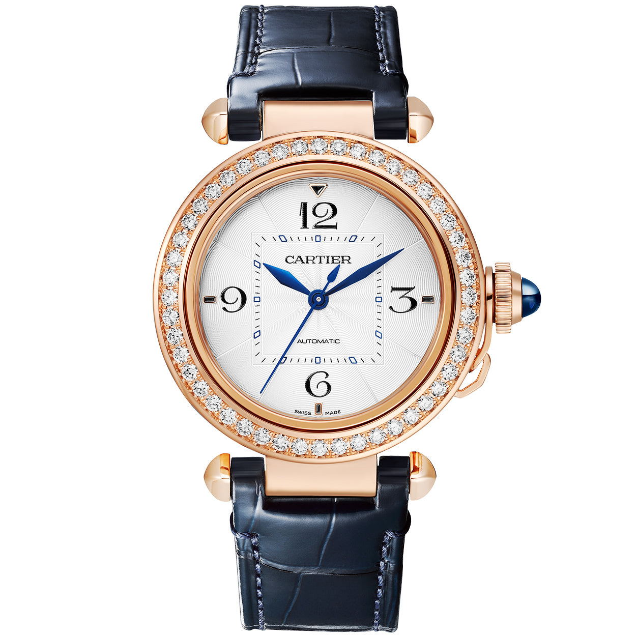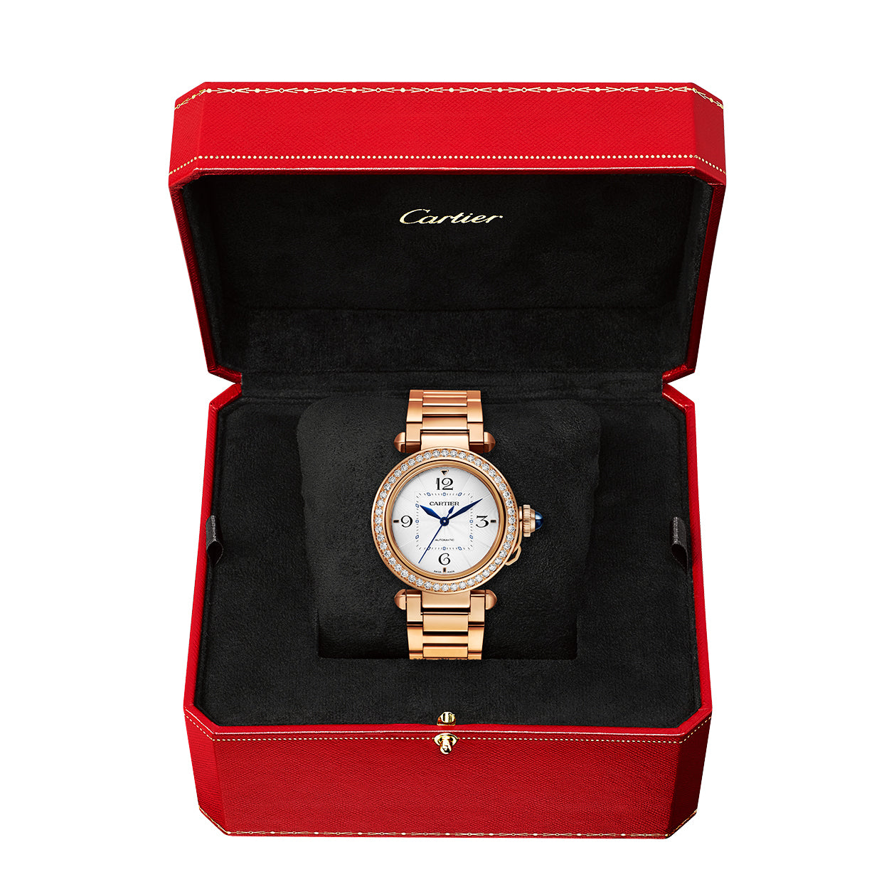 Cartier Pasha de Cartier 35mm 18ct Rose Gold Diamond Set Bracelet Watch WJPA0013. 18ct rose gold 35mm case and diamond-set bezel all on a matching 18ct rose gold bracelet and comes complete with additional leather strap. This ladies watch has a silvered flinque dial with blued steel hands. Water resistant up to 100m and sapphire crystal glass. Automatic movement.
