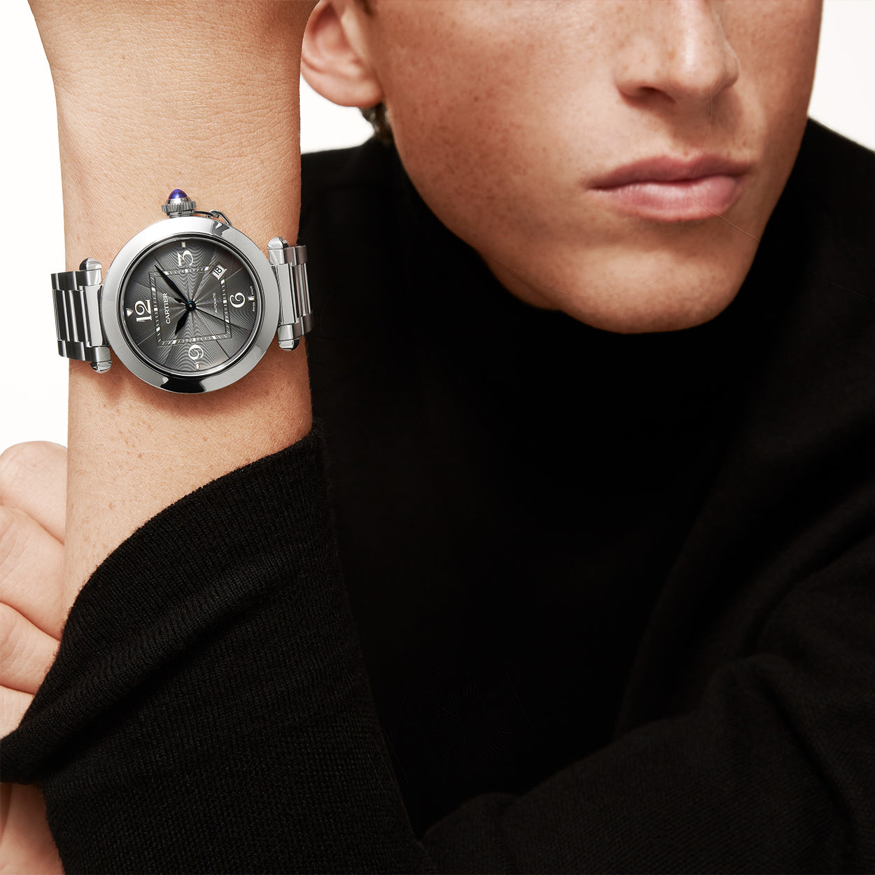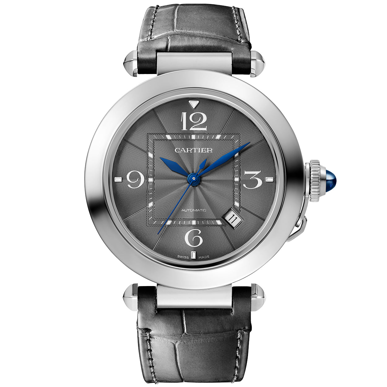 Cartier Pasha de Cartier 41mm Grey Dial Men's Automatic Bracelet Watch WSPA0026. Stainless steel 41mm case and bezel all on a matching stainless steel bracelet and comes complete with additional black leather strap. This men's watch has a grey guilloche dial with blued steel hands and date display at the 4:30 o'clock position. Sapphire crystal glass and water resistant up to 100m. Automatic movement.