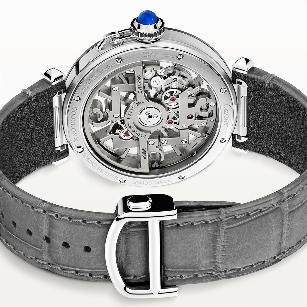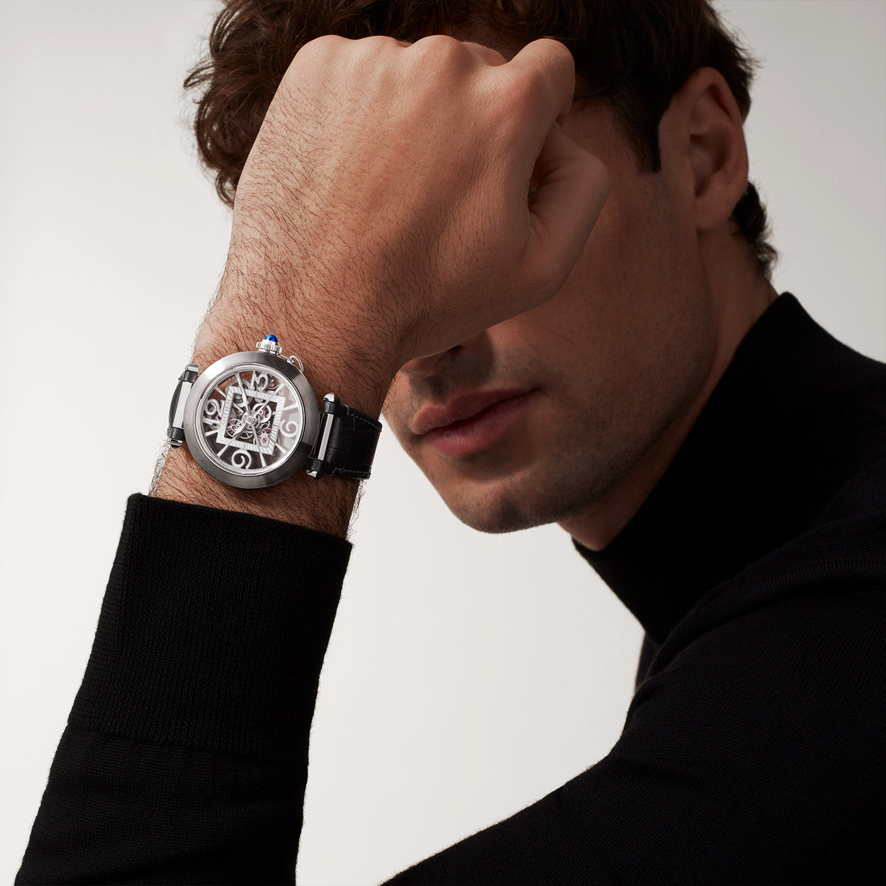 Cartier Pasha de Cartier Skeleton 41mm Black ADLC Men's Watch WHPA0017. Steel & black ADLC 41mm case and bezel all on a black leather strap and comes complete with additional leather strap. This men's watch has a openwork skeleton dial with blackened hands and hour display . Sapphire crystal glass and water resistant up to 30m. Automatic movement.