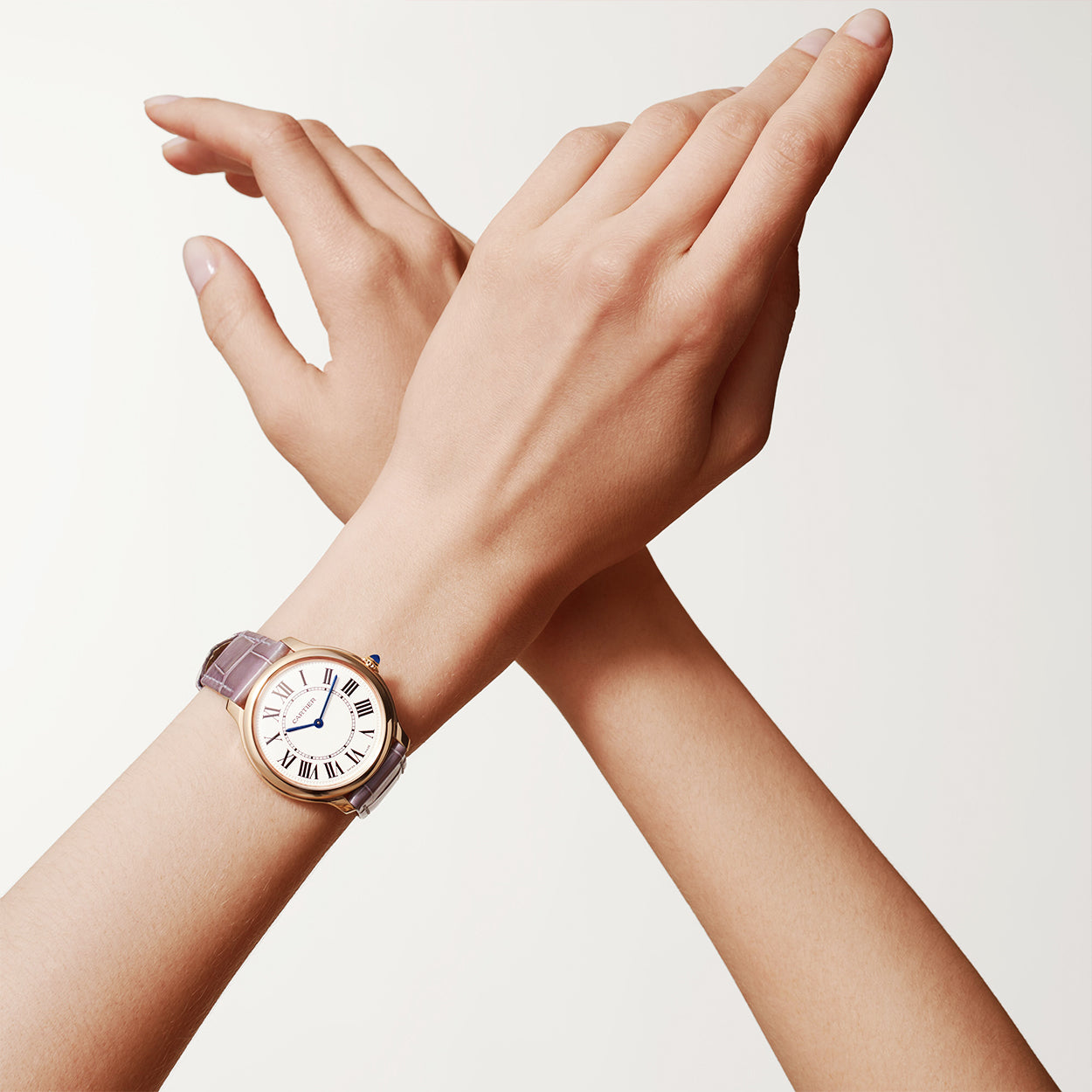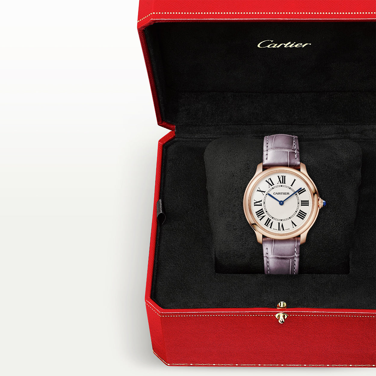 Cartier Ronde Louis de Cartier 36mm 18ct Rose Gold Strap Watch WGRN0012. 18ct rose gold 36mm case and bezel all on a purple strap. This ladies watch features a sandblasted beige dial with blued steel hands and black roman numerals. Water resistant up to 30m and sapphire crystal glass. Quartz movement.