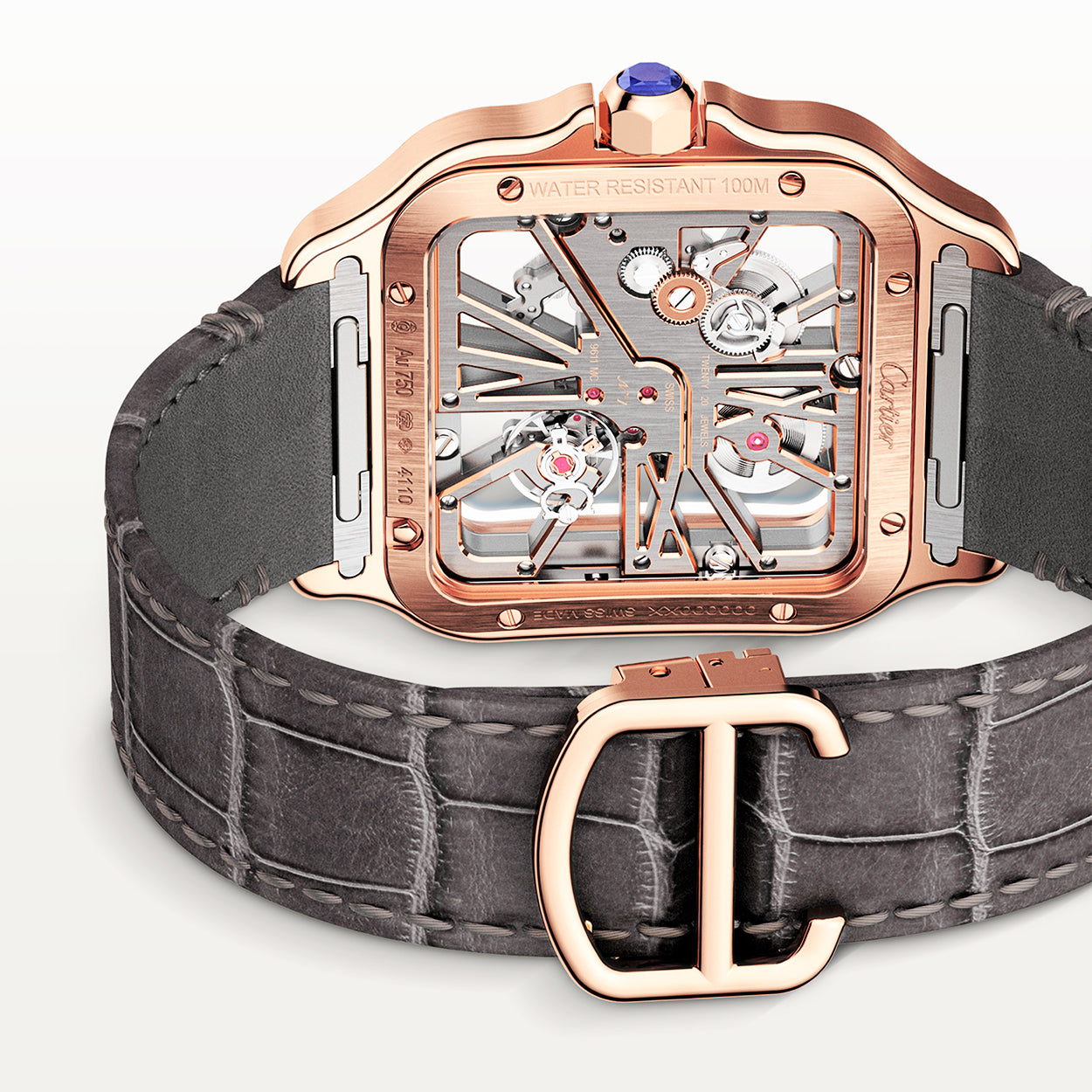 Cartier Santos de Cartier Large 18ct Rose Gold Skeleton Dial Strap Watch WHSA0018. 18ct rose gold 47.5mm x 39.7mm case and bezel all on a grey alligator leather strap and comes complete with blue strap. This men's watch features a skeleton dial with rose golden hands. Synthetic sapphire crystal glass and water resistant up to 100m. Power reserve up to 72 hours. Manual-wind movement.