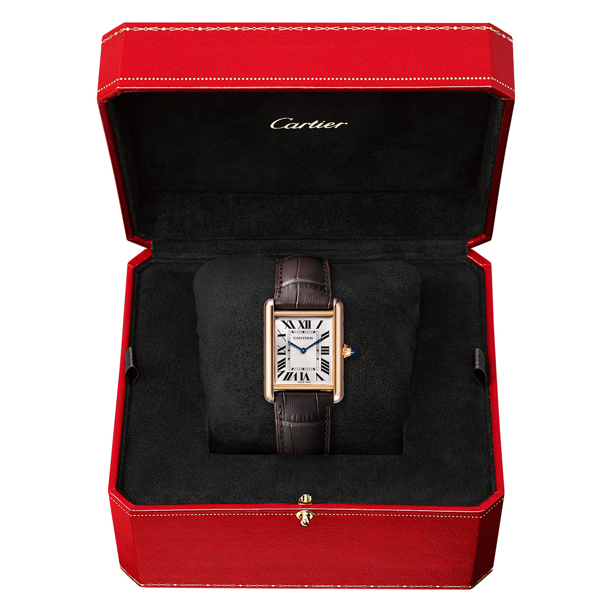 Cartier Tank Louis Cartier 18ct Rose Gold Large Model Leather Strap Watch WGTA0011. 18ct rose gold 25.5mm x 33.7 case and bezel all on a brown alligator leather strap. This watch has a silvered dial with black roman numerals and blued steel hands. Water resistant up to 30m and sapphire crystal glass. Manual-wind movement.