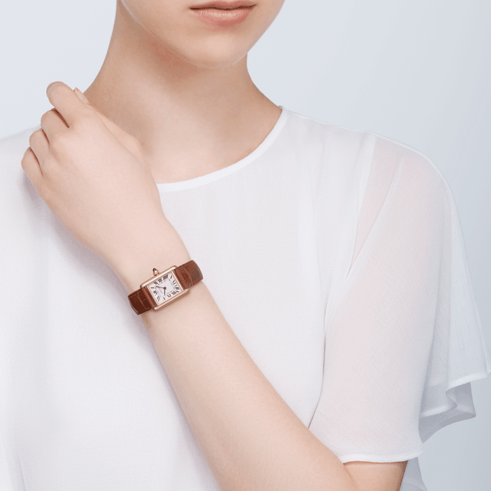 A watch with incredible sophistication. The timeless Tank Louis Cartier watch was worn by Louis Cartier himself. and Features these distinct rounded lugs introducing a rich brown alligator strap fitted with 18k yellow gold ardillon buckle. The change in lug design marked the contribution made by Louis Cartier to the style that was later recognised as art deco. This beautiful Tank Louis Cartier watch Features the familiar silver grained dial with bold black Roman numeral hour indexes representing each location. The tenth hour reveals the secret Cartier Signature- the brand lettering in miniature form which replaces one half of the