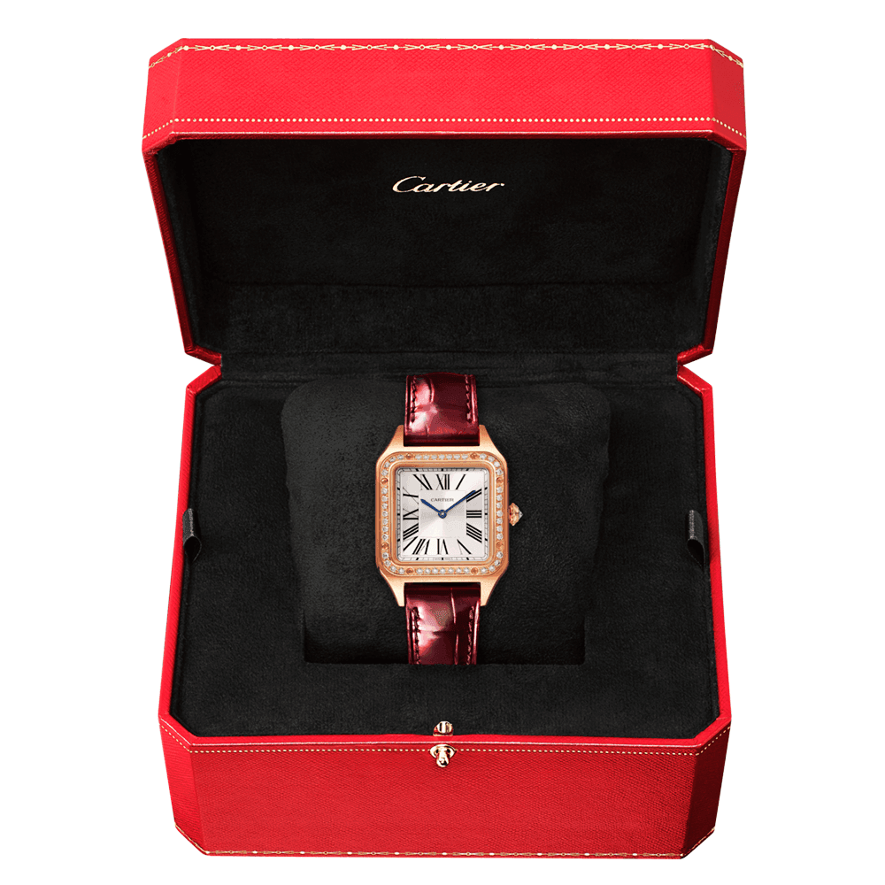 Cartier Santos Dumont Small 18ct Rose Gold Silver Dial Diamond Set Bezel Strap Watch