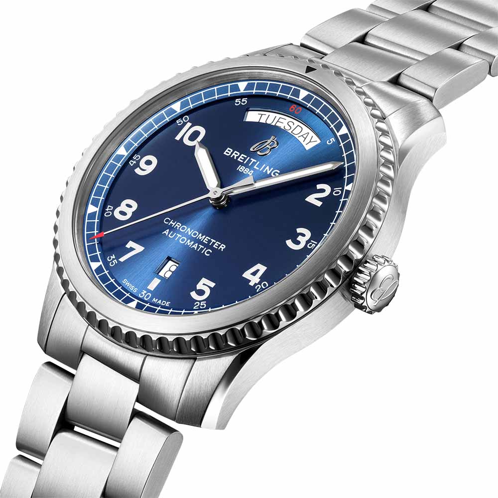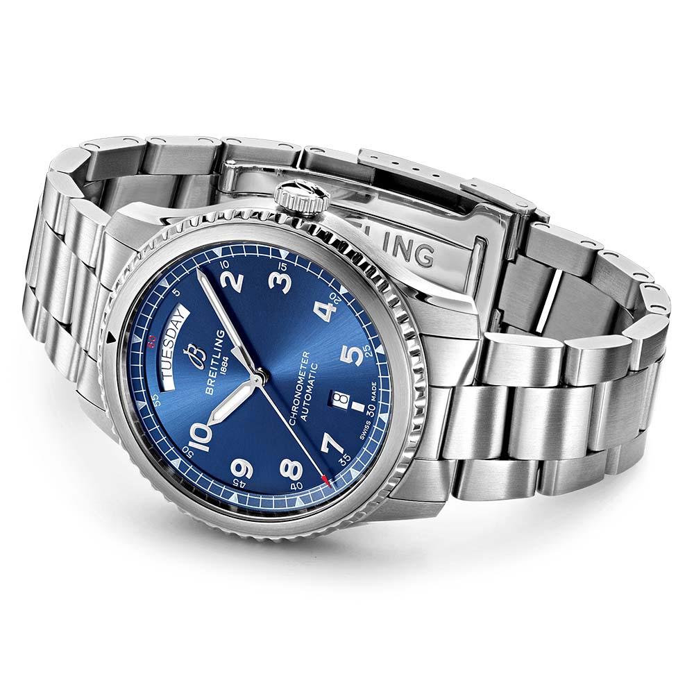 The Breitling Aviator 8 Day & Date 41mm impressively displays the day. date. and time with the day at 12 o'clock and the date at 6 o'clock. Powered by the Calibre 45. it has an efficient bidirectional rotor winding with over 40 hours of power reserve. The steel case with solid screwed back measures 41mm and comes with a steel bracelet or leather strap. A double anti-reflection sapphire glass showcases the black or blue dial.