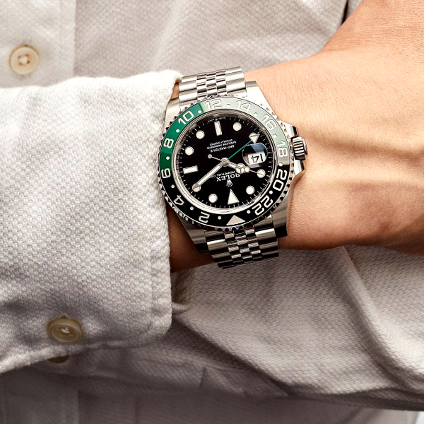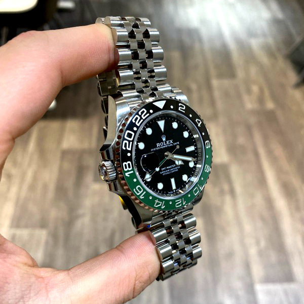 The case is stainless steel with brushed lugs and high-polish finished sides. The bezel is steel with a black and green 24-hour ceramic insert. Stainless steel left sided crown and case back are screw-down to keep the watch water-resistant. It features an oyster bracelet where links are polished down the middle and brushed on either side.