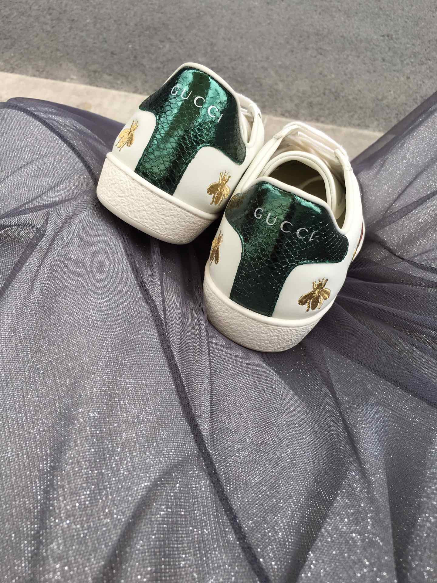- White leather with gold thread-embroidered bees and stars and green ayers snake detail at the heel