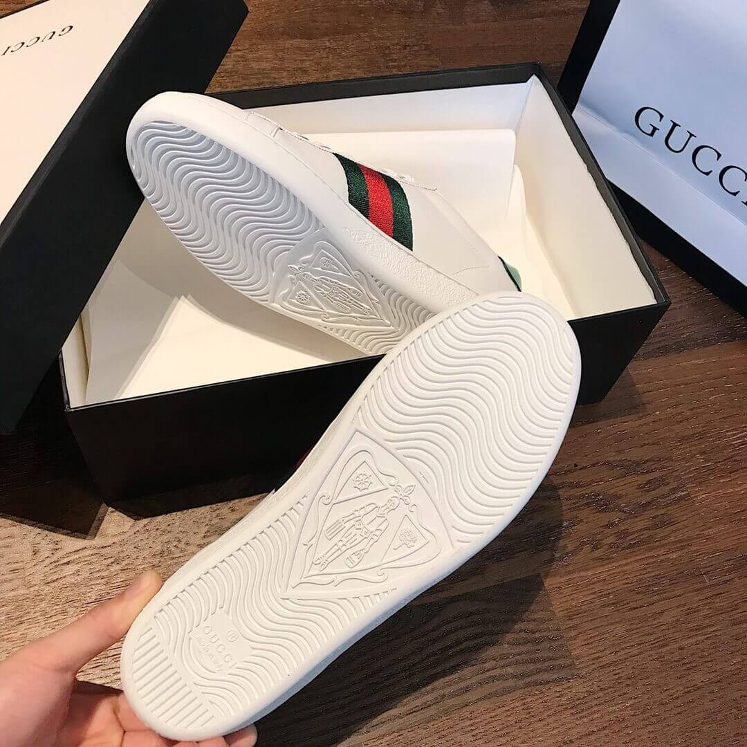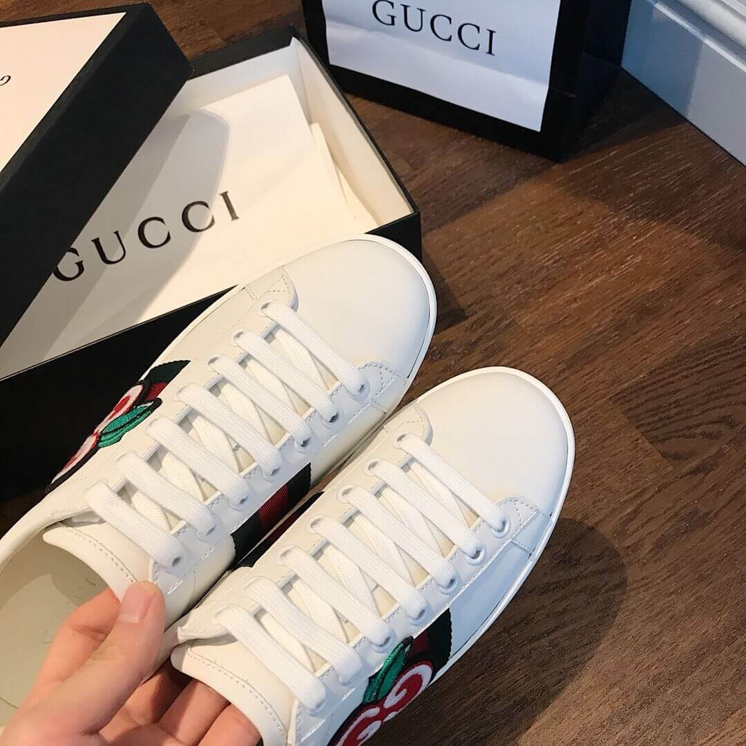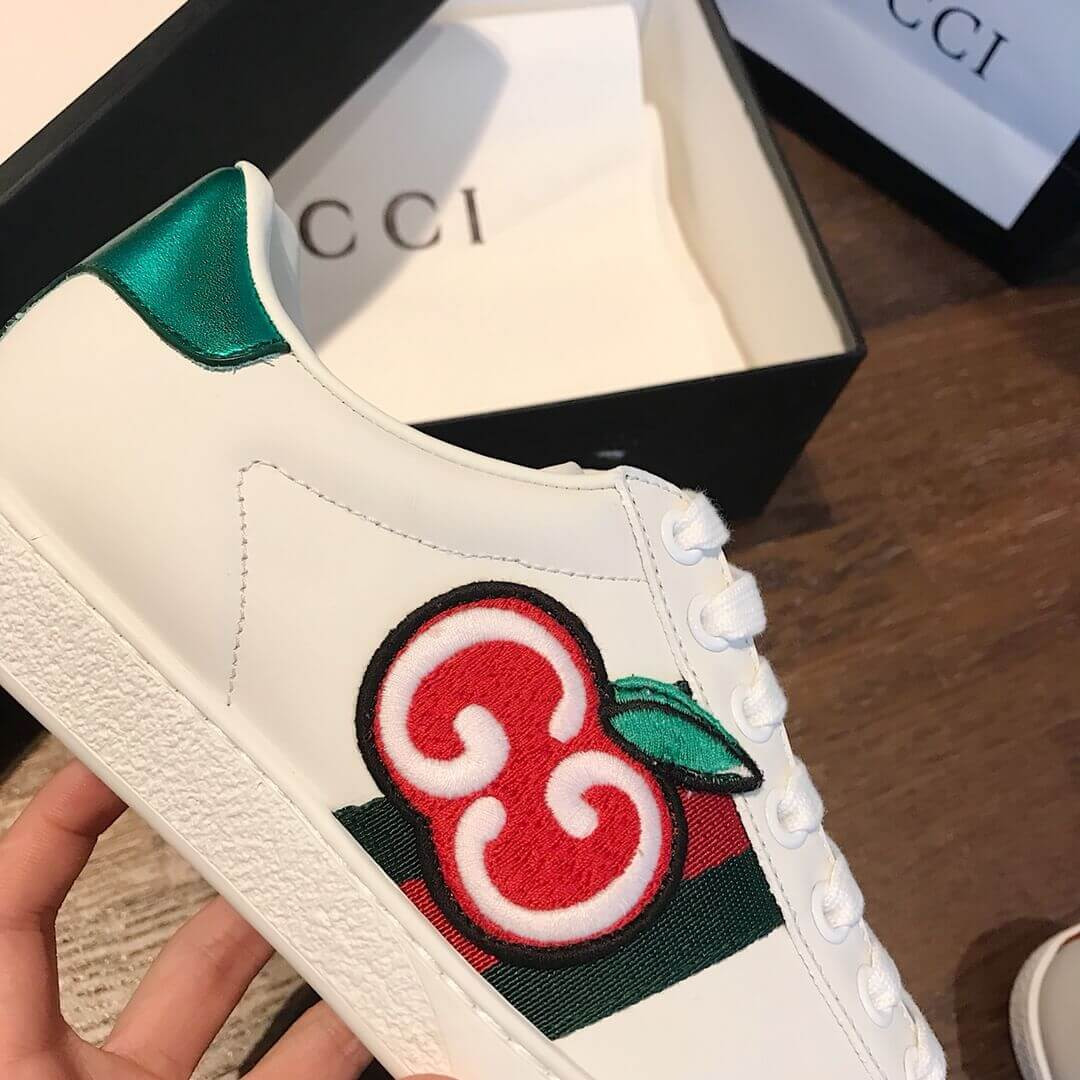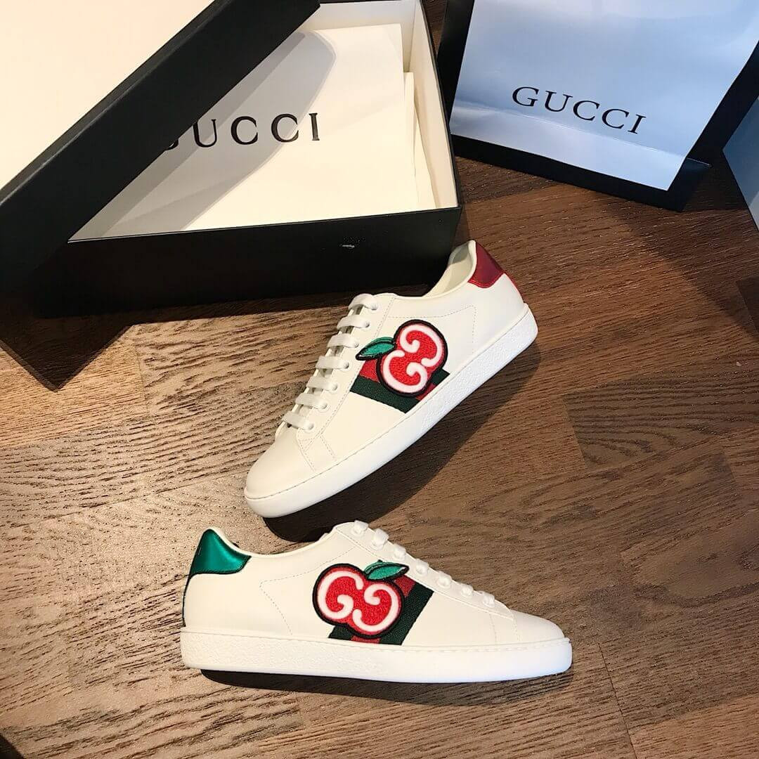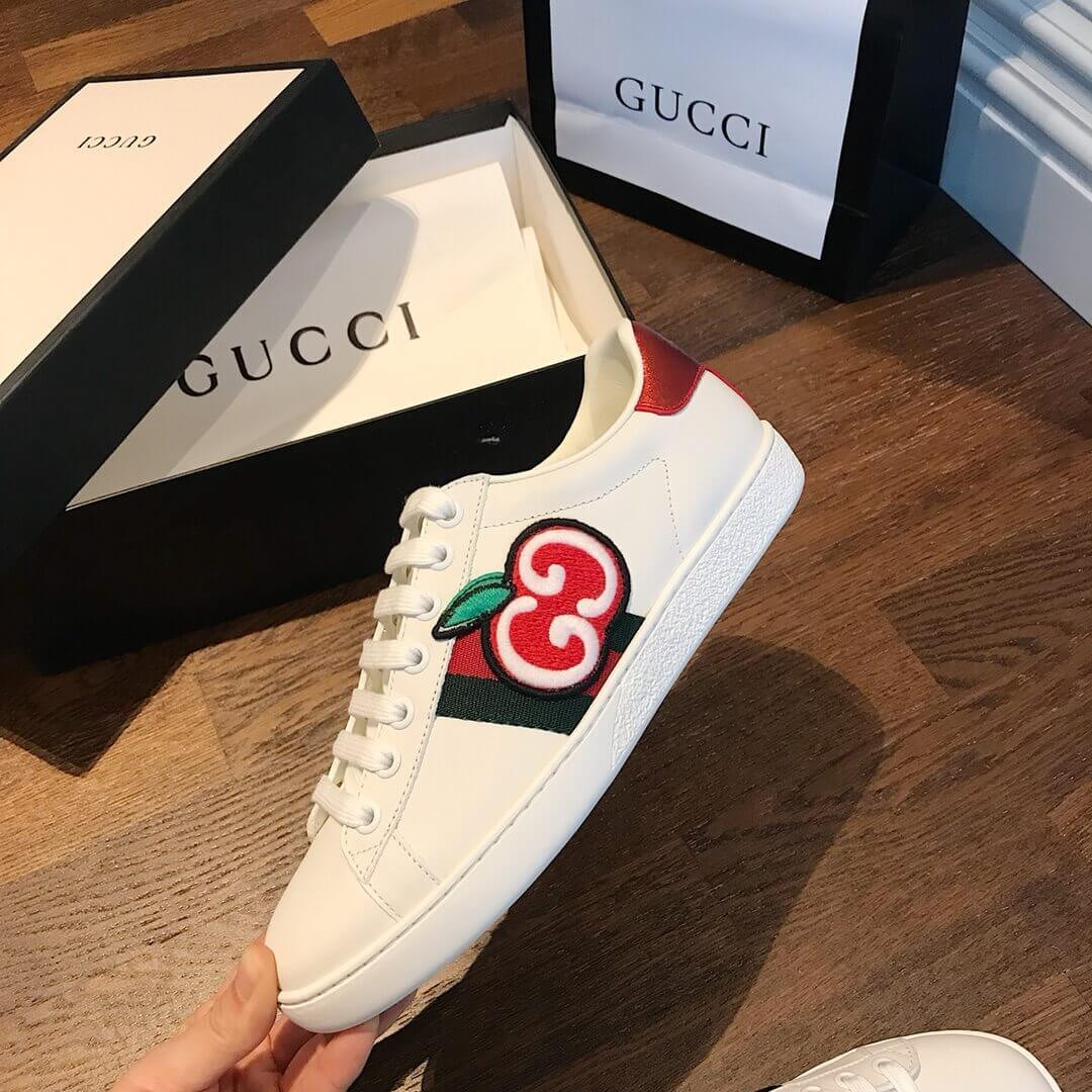 Crafted from soft, white leather, the emblematic women's Ace sneaker is enhanced with a newmotif for Cruise 2020. In a playful reinterpretation of a classic House code, a red apple outlined by the GG logo animates the classic low-top design.