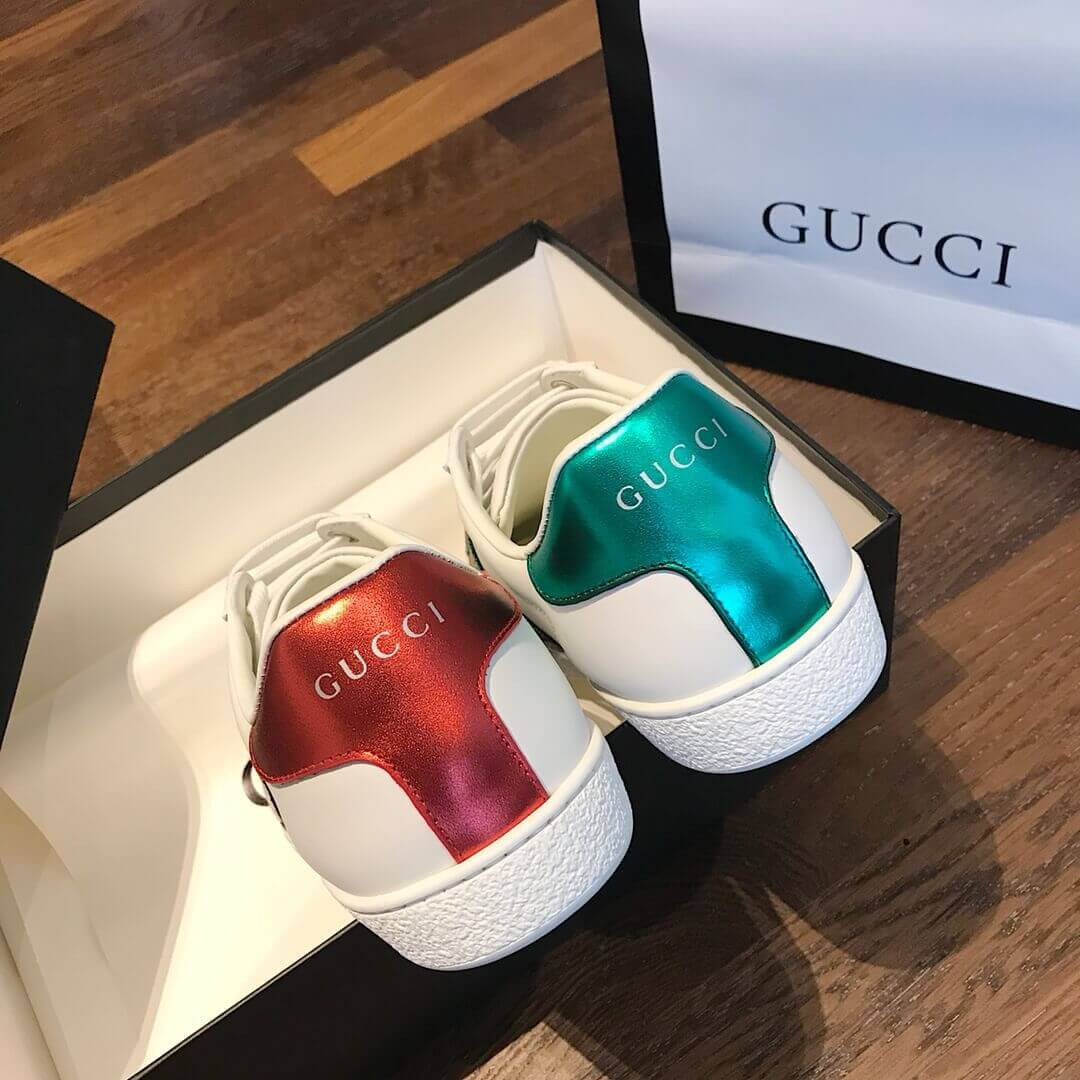 - Green metallic leather on the back of one shoe, red on the other