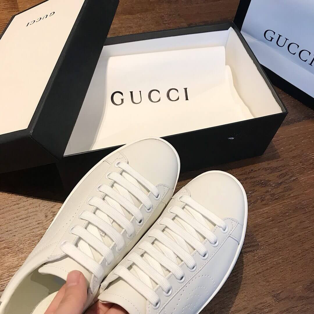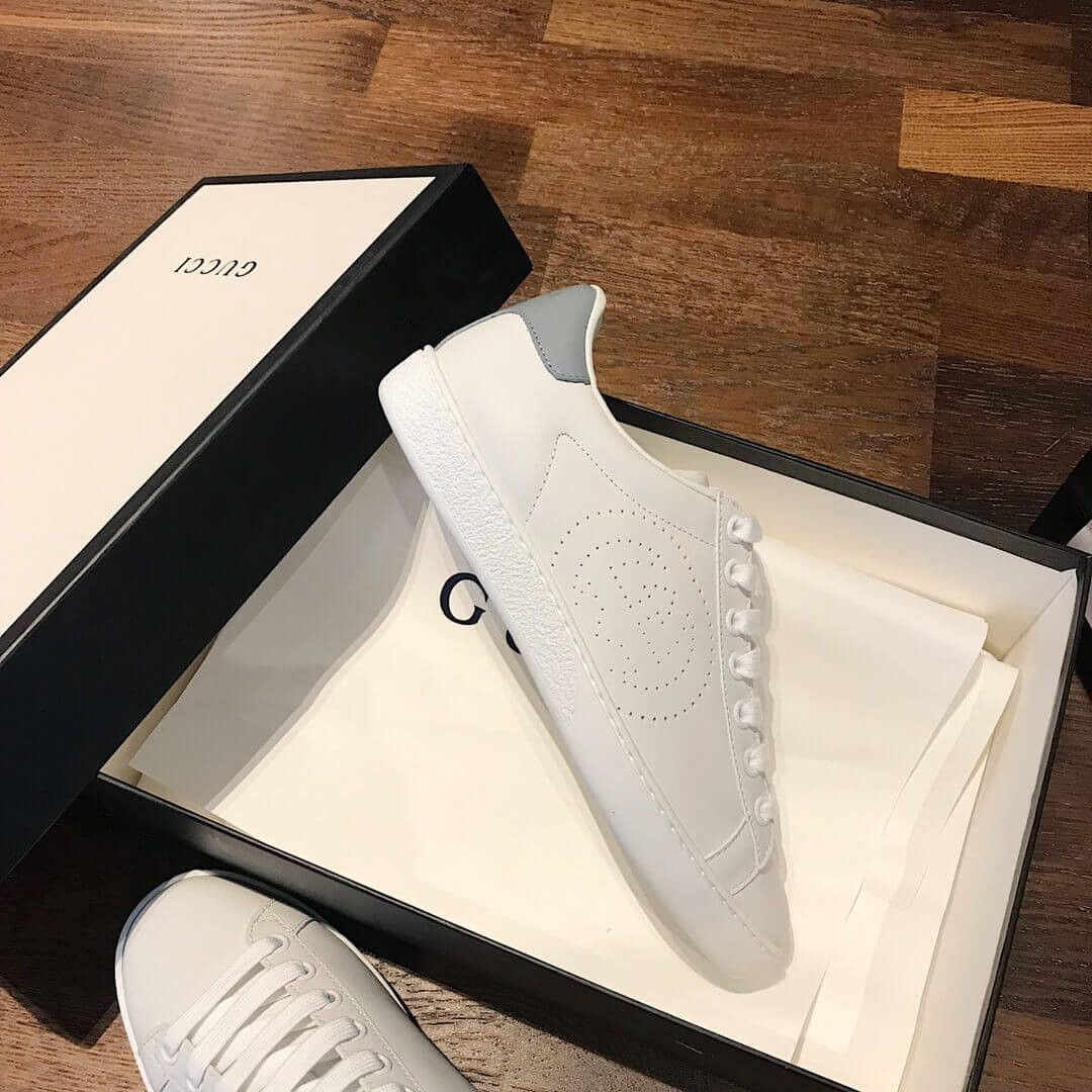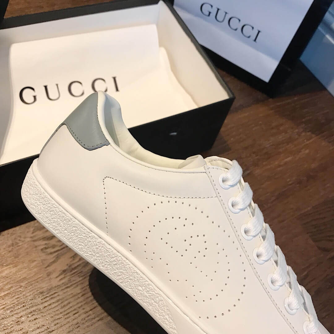 Crafted from soft, white leather, the emblematic Ace sneaker is enhanced with a minimalistlogo approach. With an intricate design, the Interlocking G is displayed on the side of the shoe, created using a perforated technique. Grey leather details at the back of the shoe add a subtle hint of color to the all-white style.