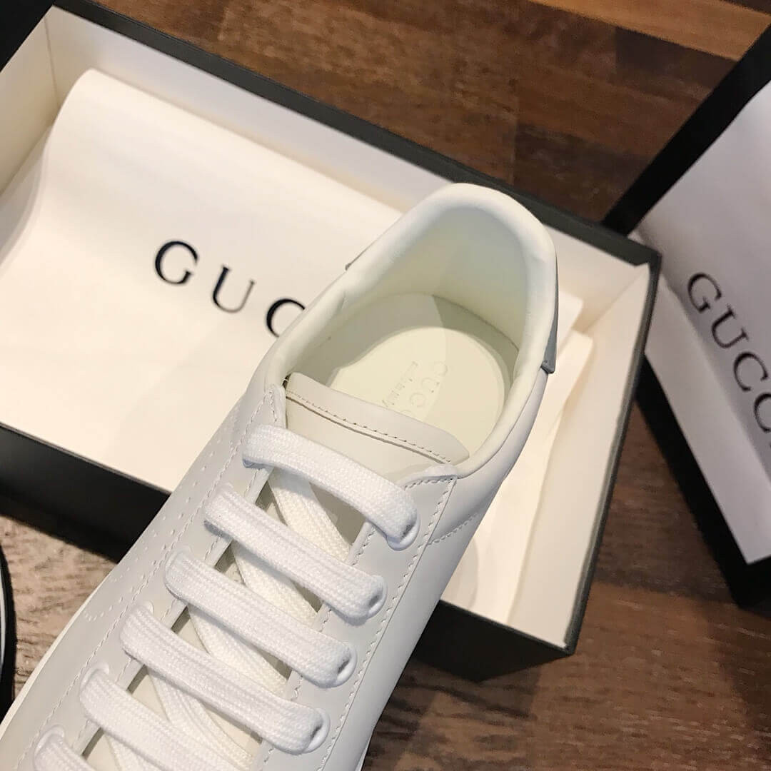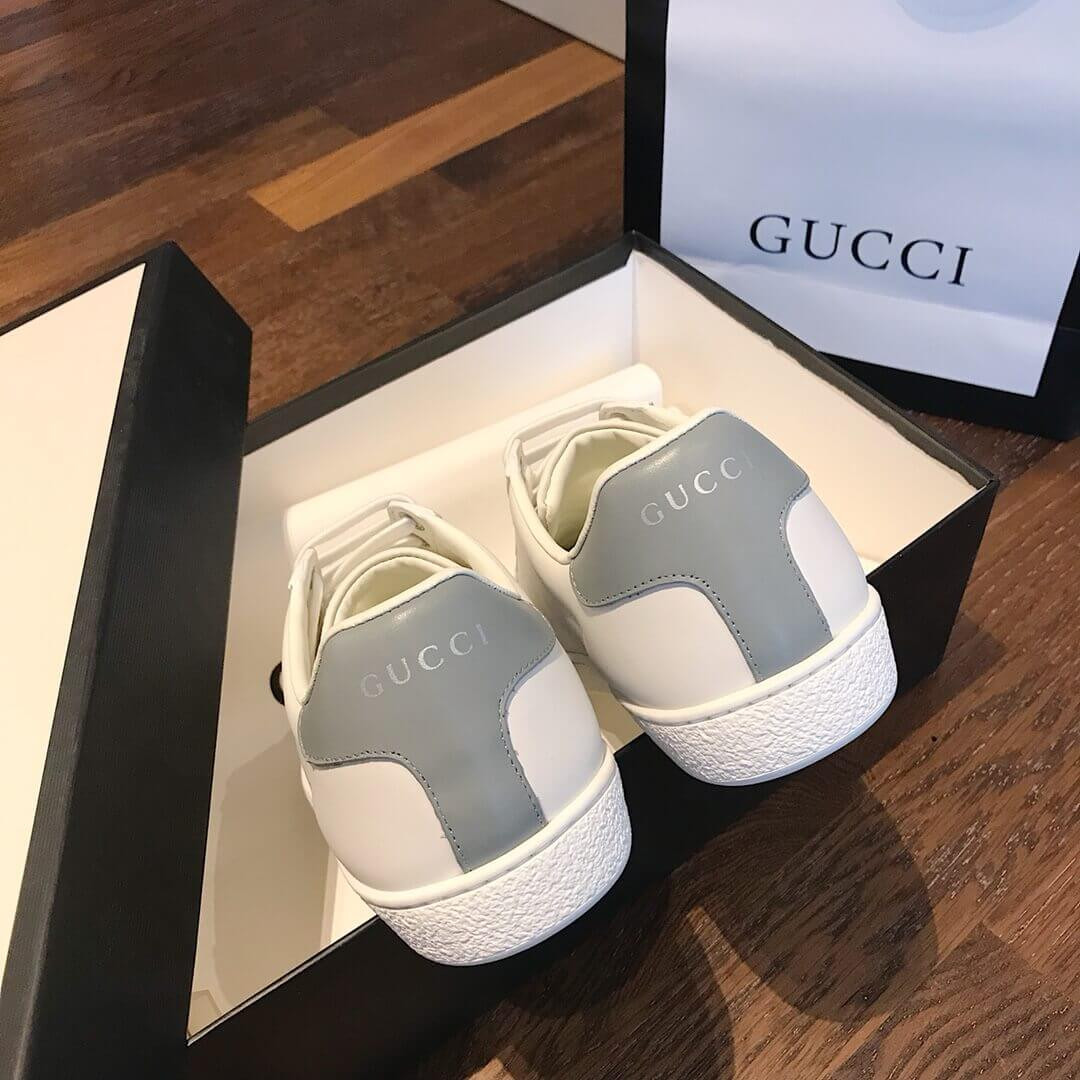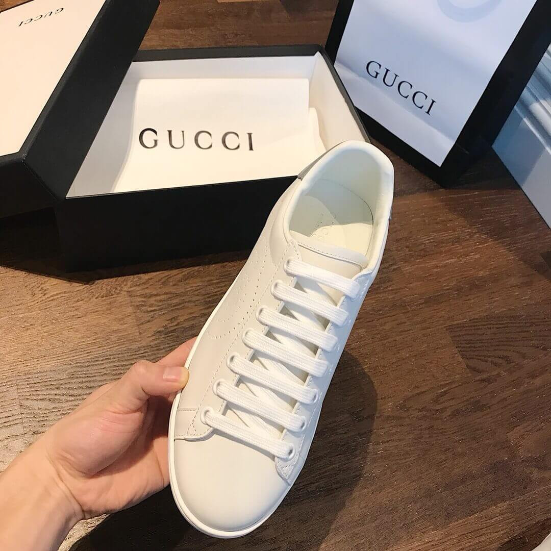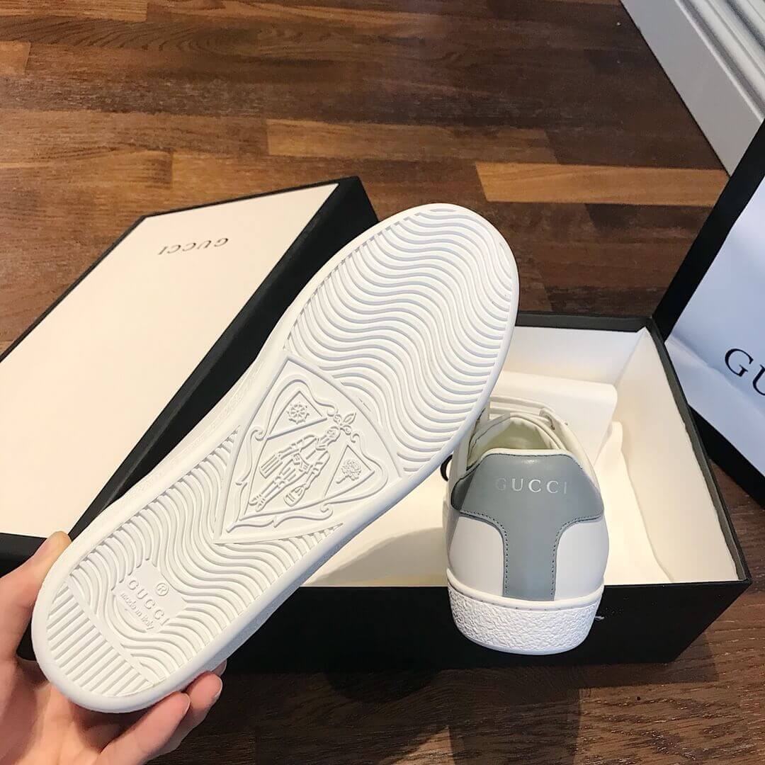 Crafted from soft, white leather, the emblematic Ace sneaker is enhanced with a minimalistlogo approach. With an intricate design, the Interlocking G is displayed on the side of the shoe, created using a perforated technique. Grey leather details at the back of the shoe add a subtle hint of color to the all-white style.