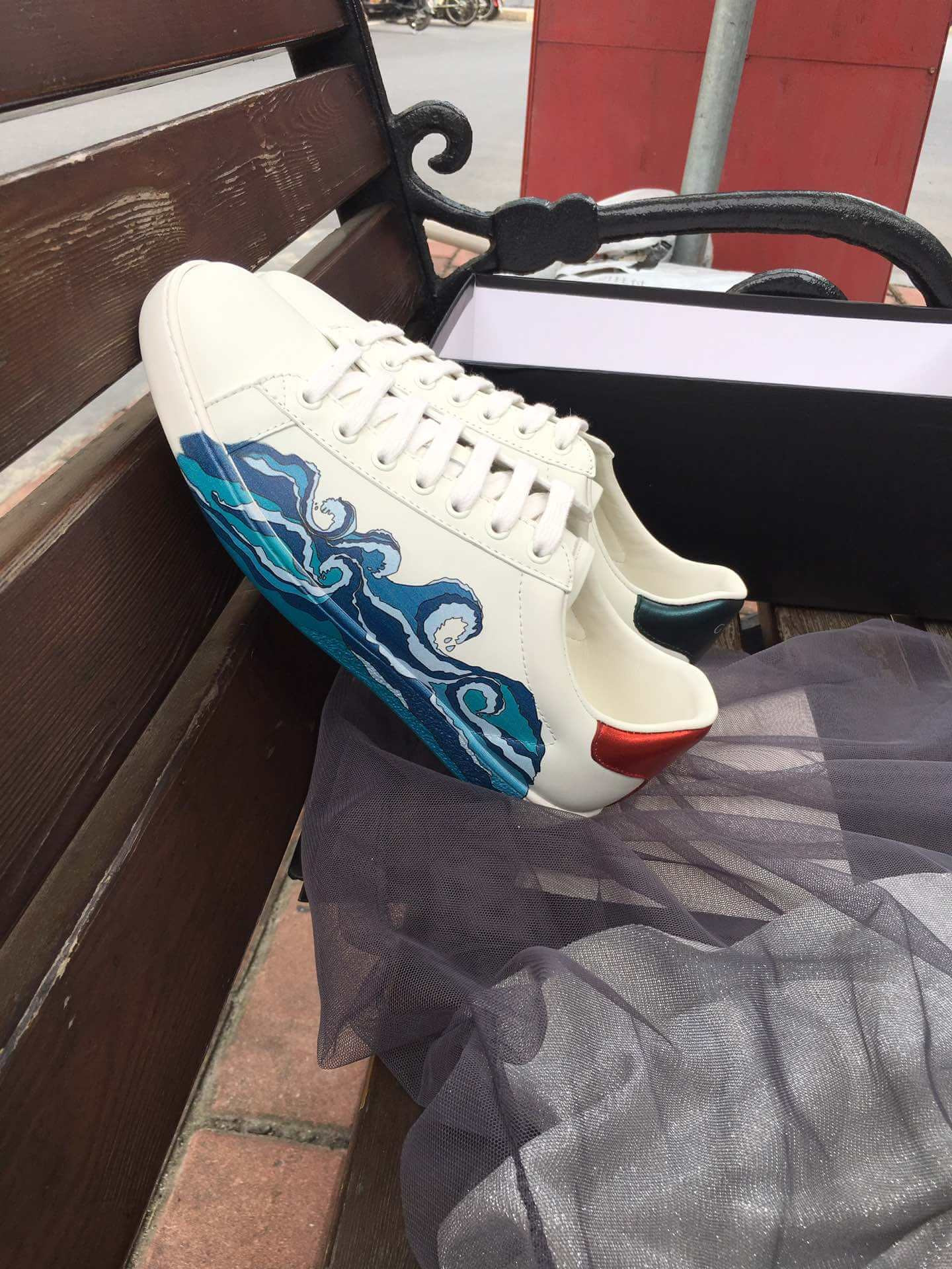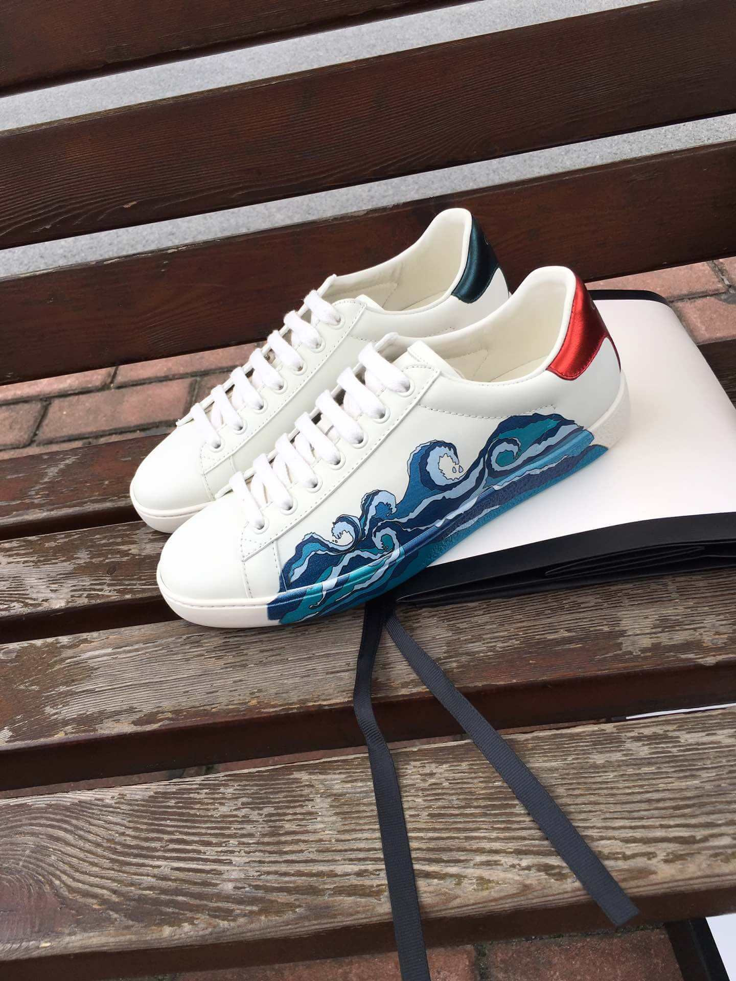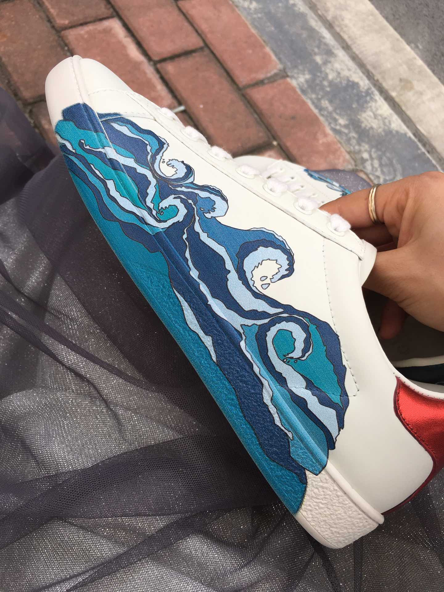 - Red ayers snake detail on the back of one shoe and blue ayers snake detail on the back of the other shoe