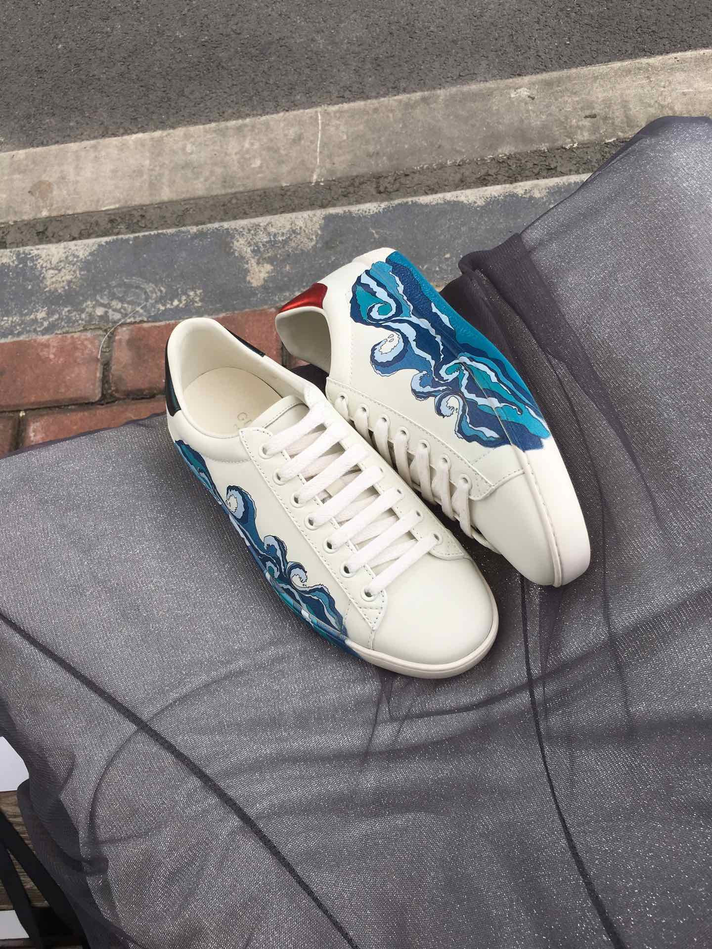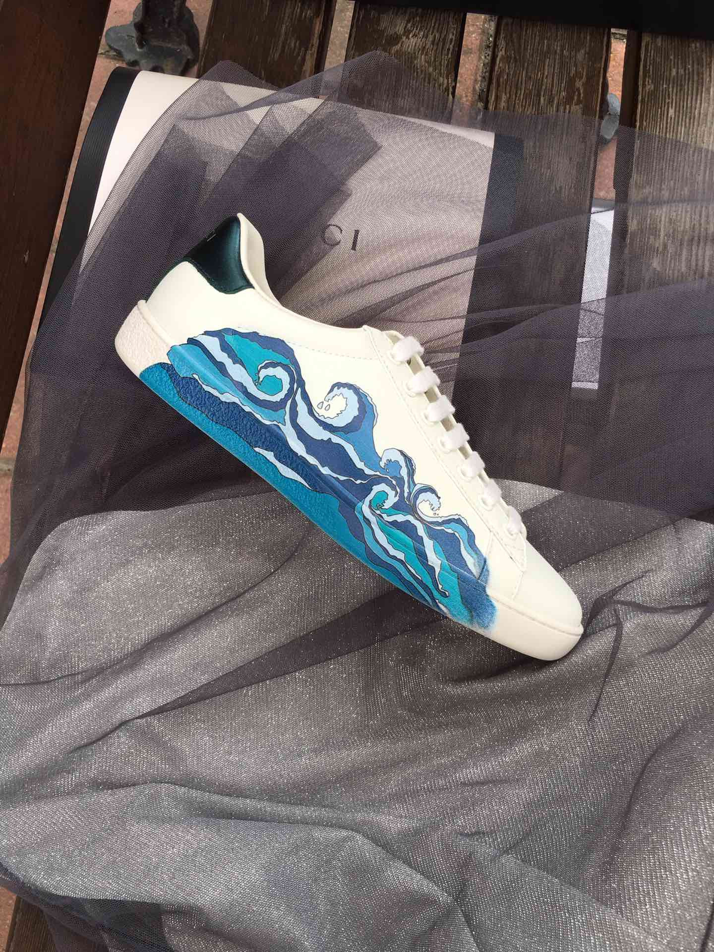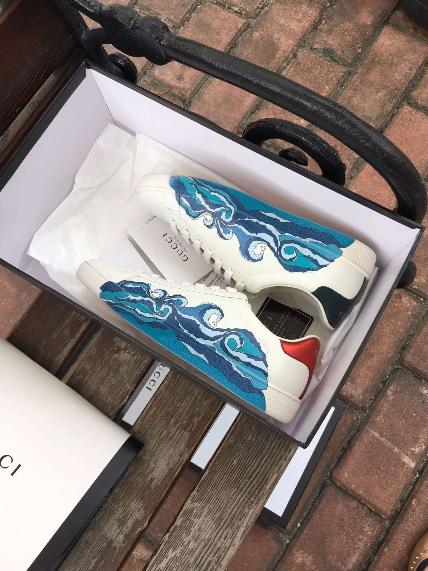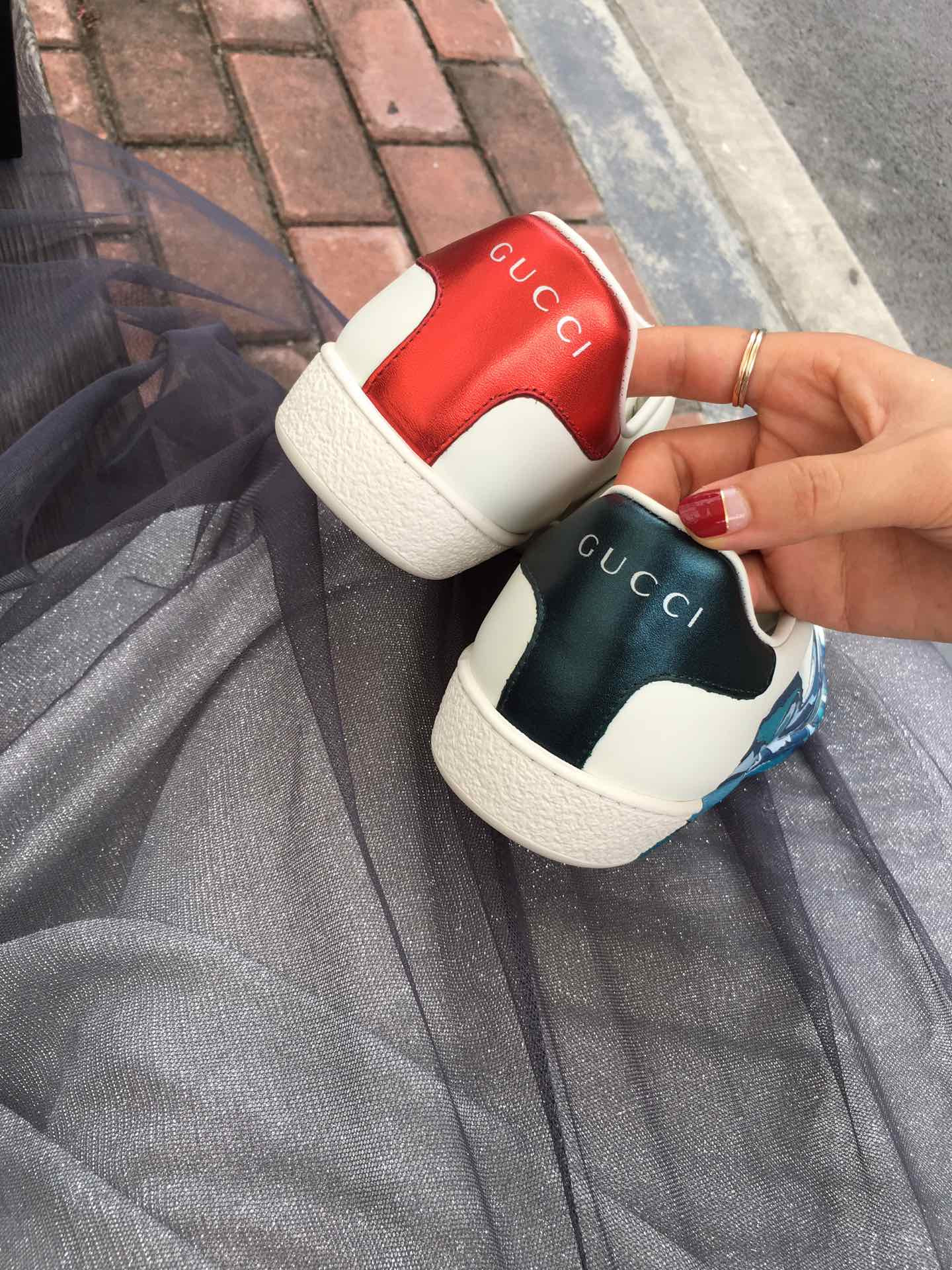 - Red ayers snake detail on the back of one shoe and blue ayers snake detail on the back of the other shoe
