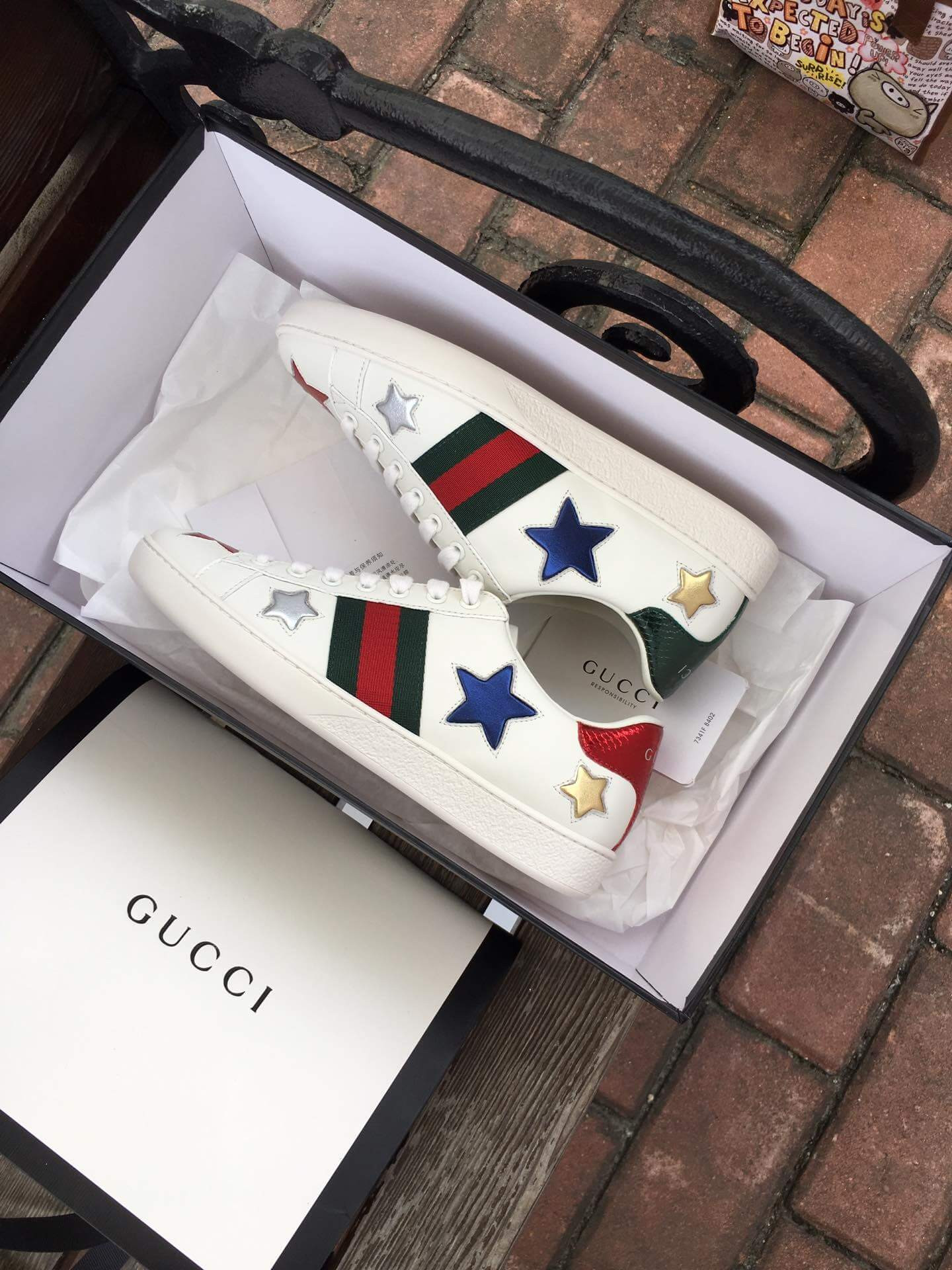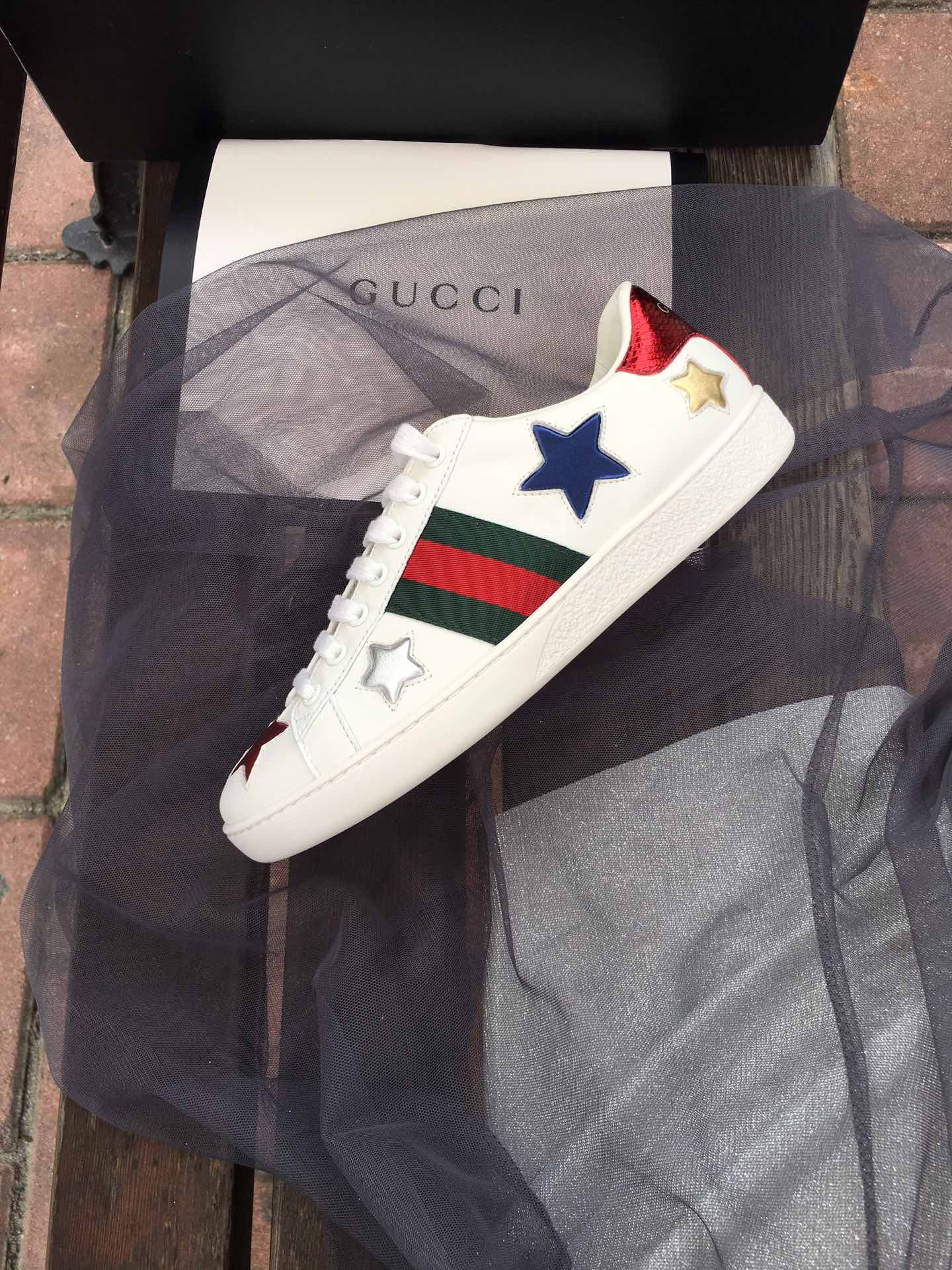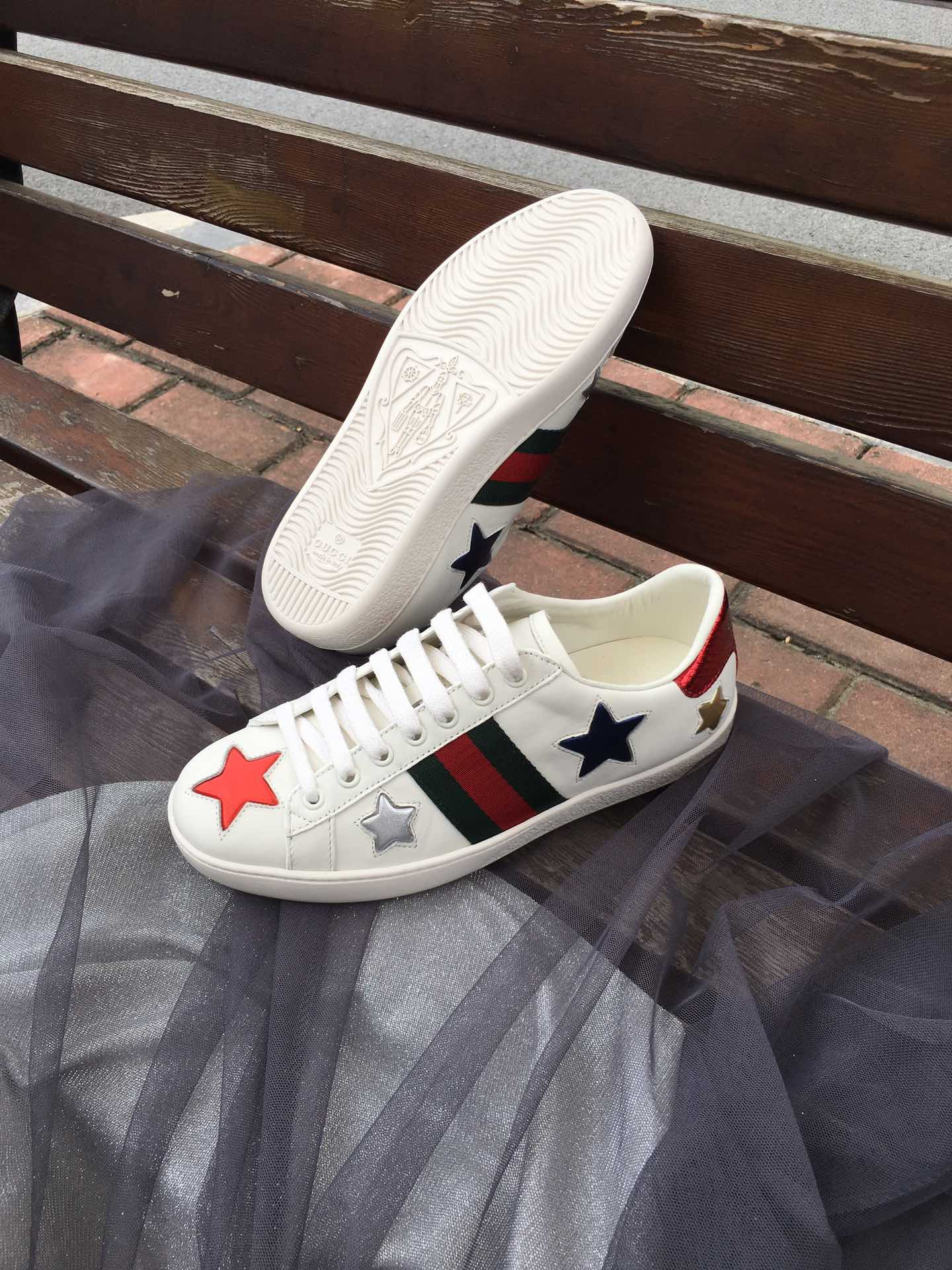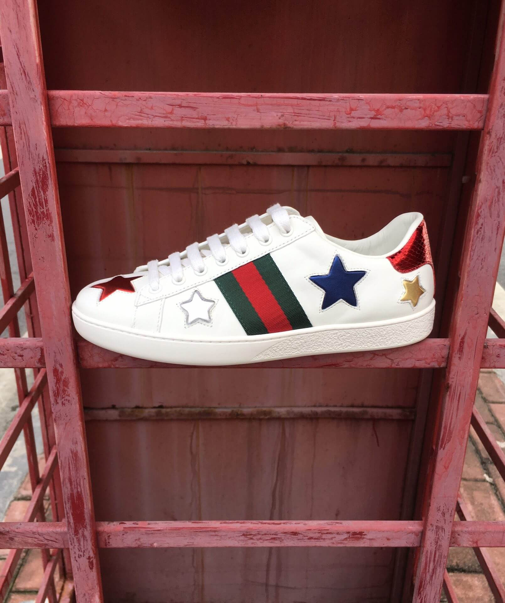 Since its debut, the Ace sneaker has become a mainstay of Gucci collections. The retro-looking design is inspired by a Gucci sneaker from the 1970s, with Web stripe along the sides. The low-top silhouette has been embellished with inlaid multicolor leather stars.