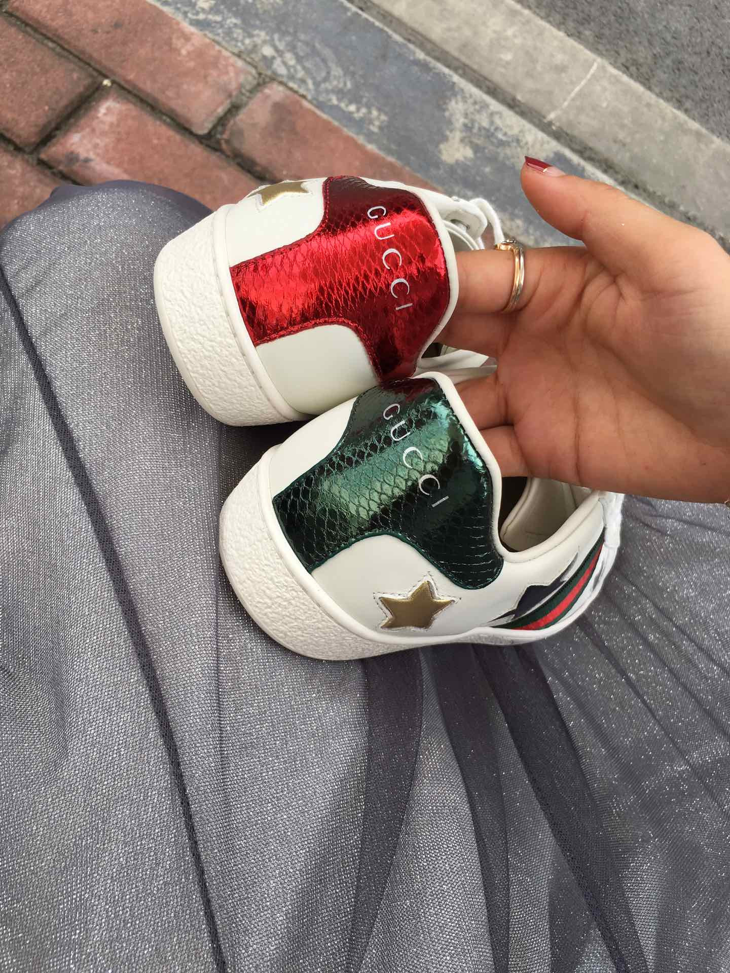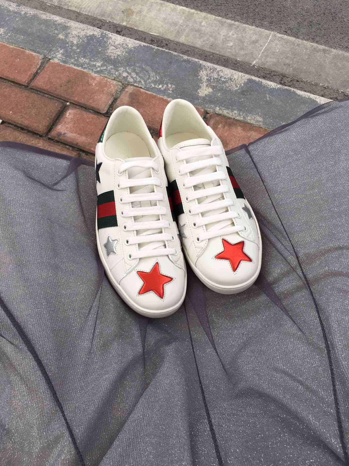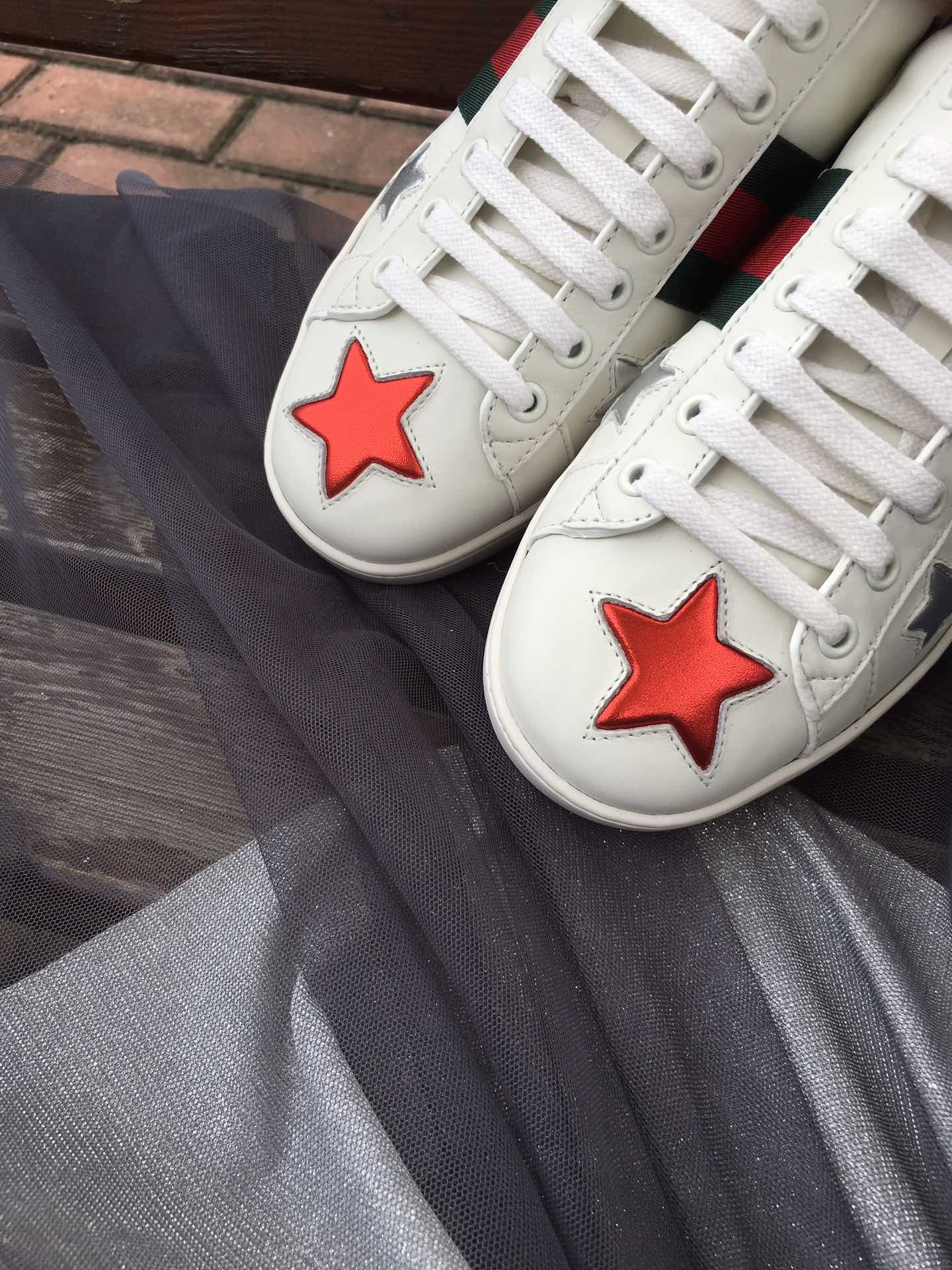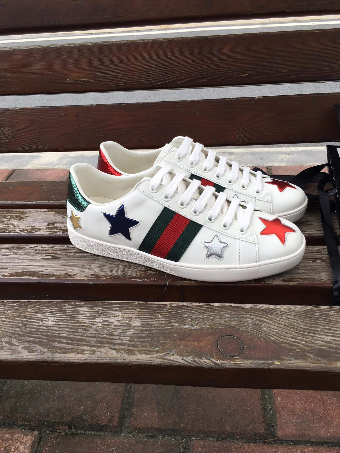Since its debut, the Ace sneaker has become a mainstay of Gucci collections. The retro-looking design is inspired by a Gucci sneaker from the 1970s, with Web stripe along the sides. The low-top silhouette has been embellished with inlaid multicolor leather stars.