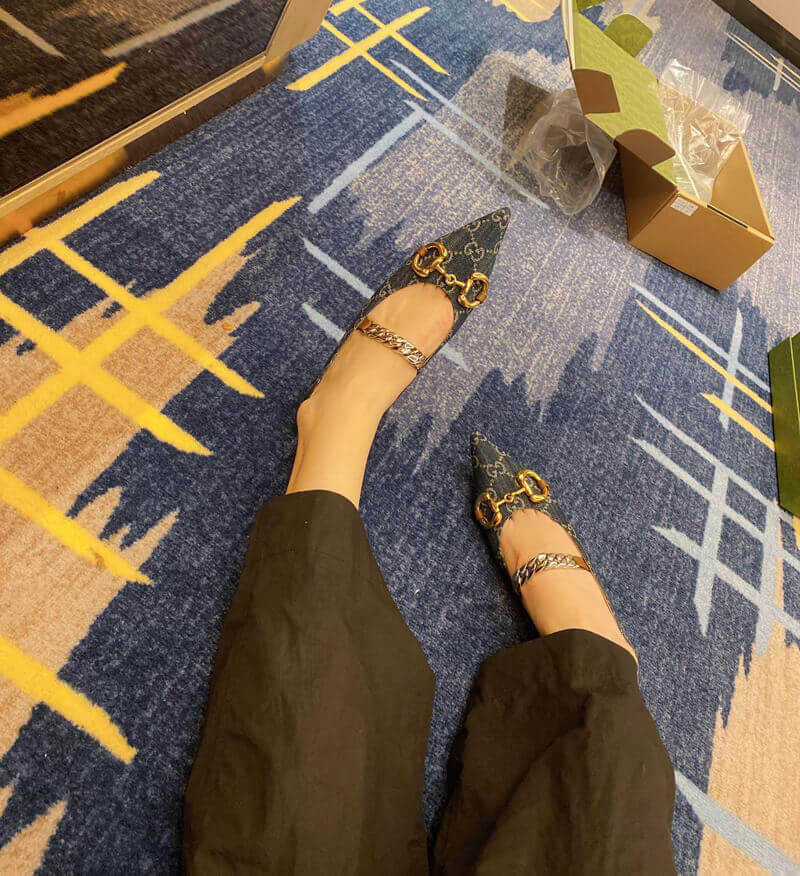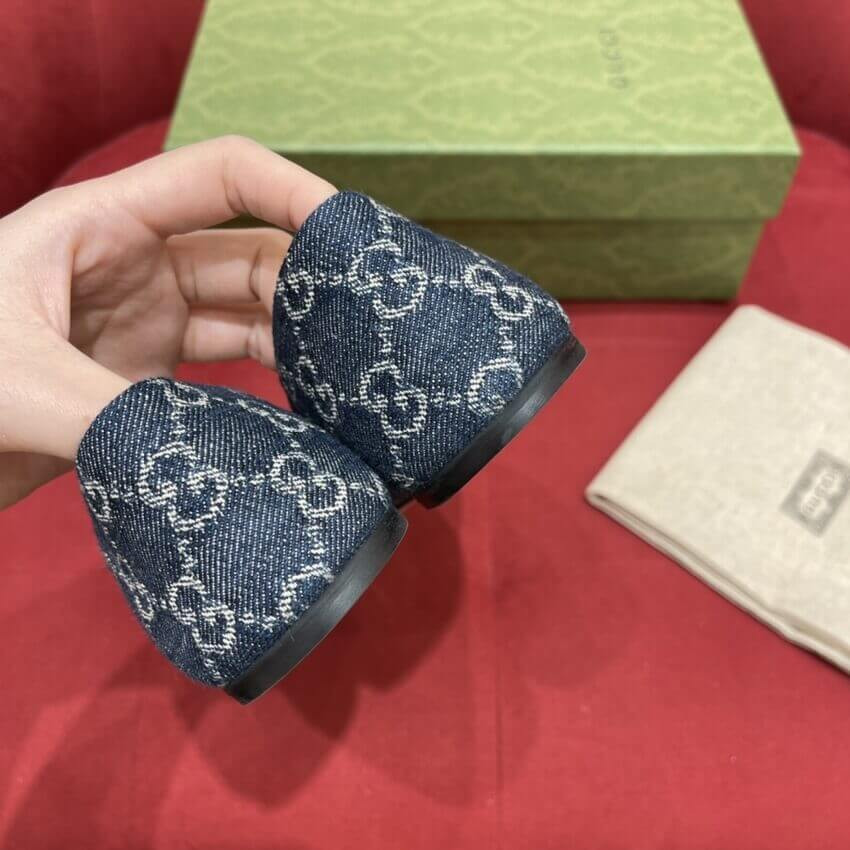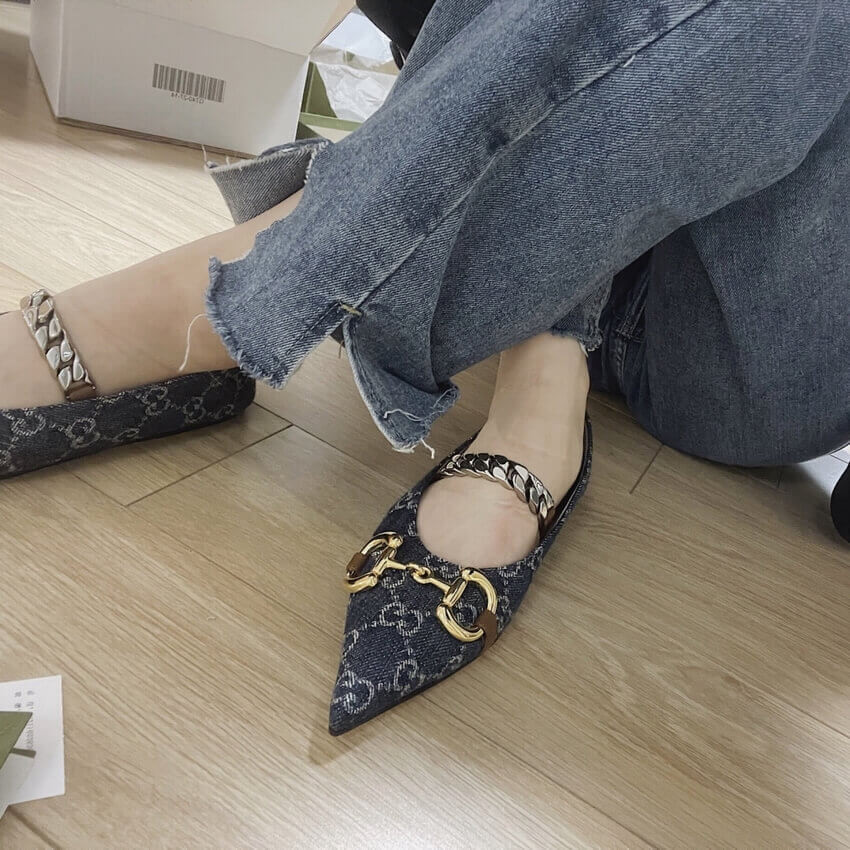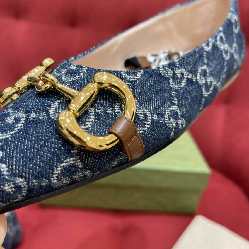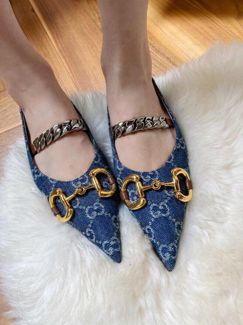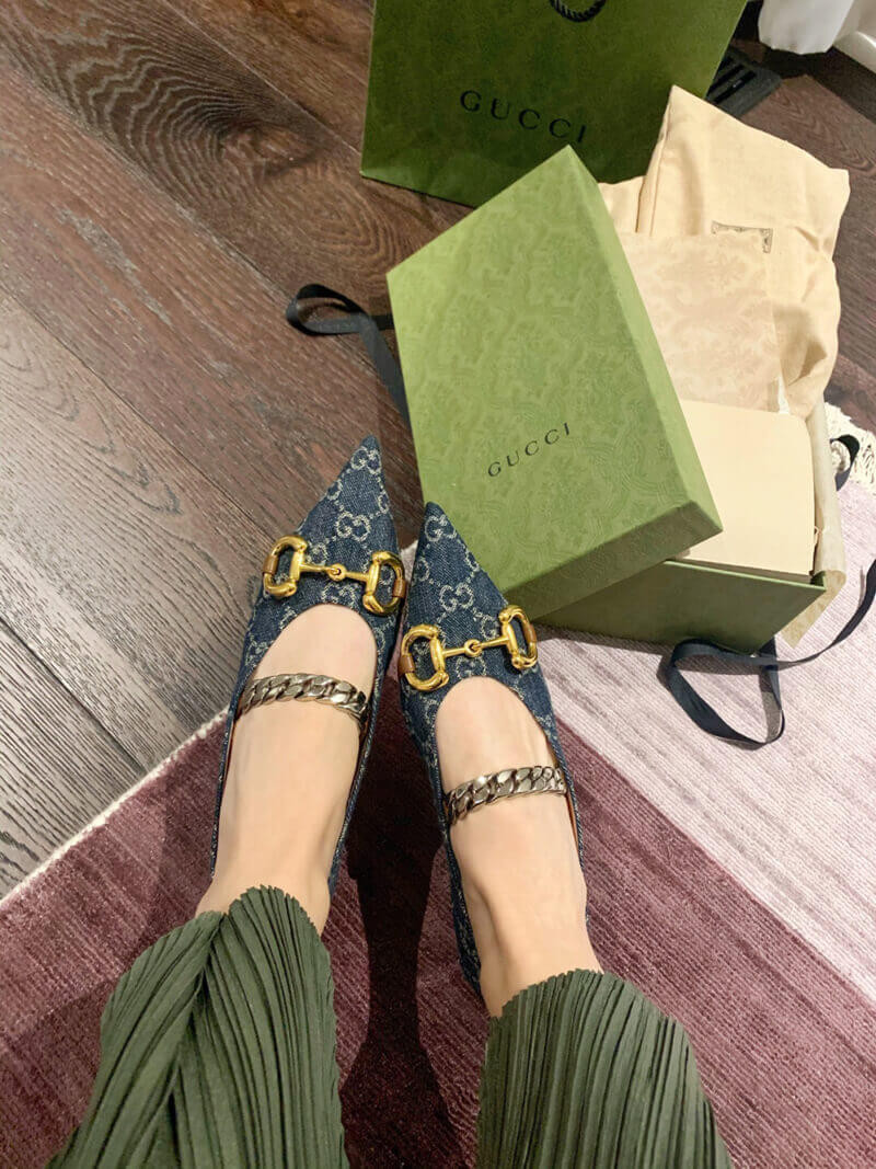 With a pointed shape, these ballet flats are defined by the silver-toned chain and a macro version of the Horsebit—the House’s most distinctive symbol paying homage to its equestrian heritage. The shoe is presented in an organic jacquard denim with the GG motif for the Epilogue collection.