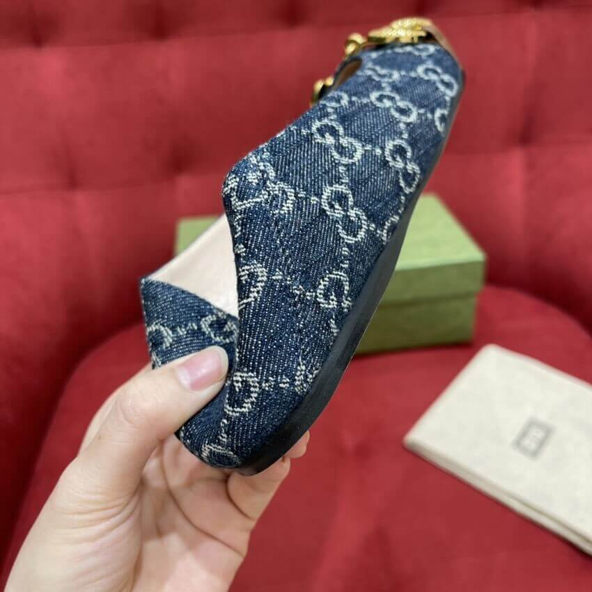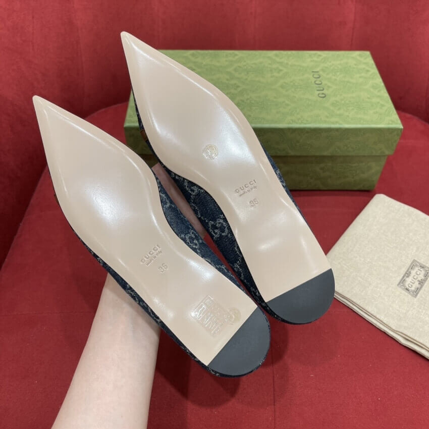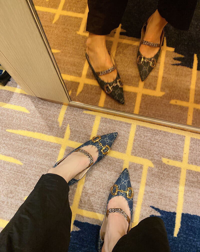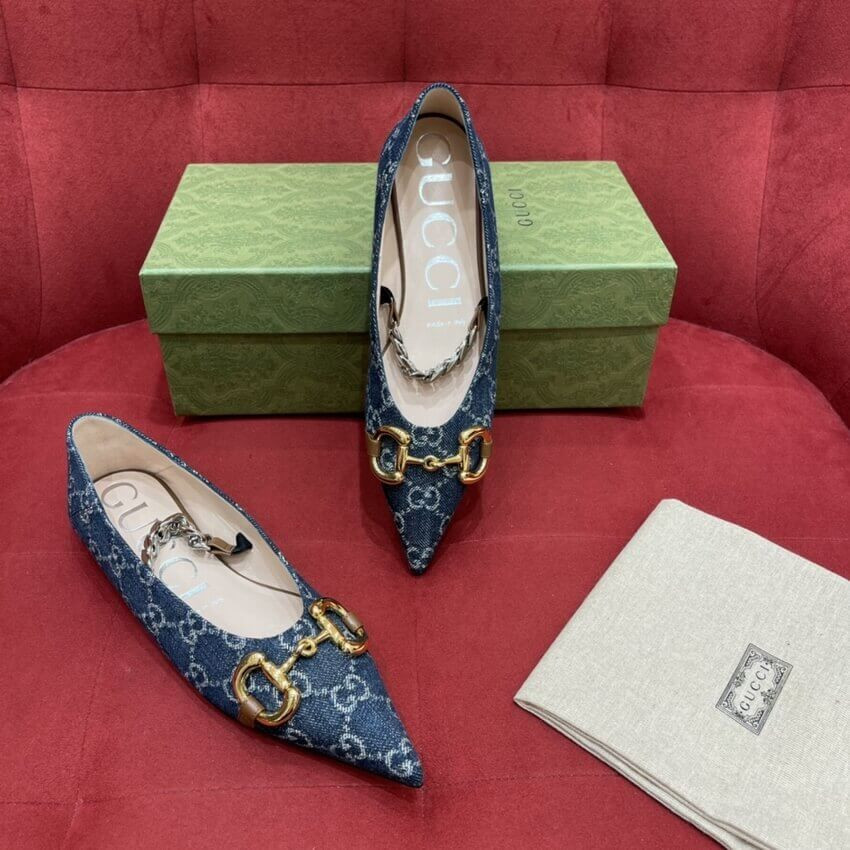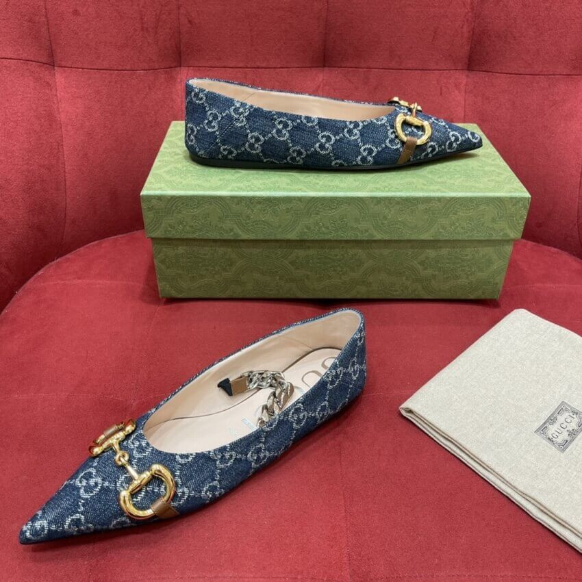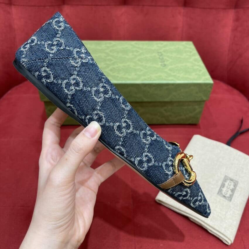 With a pointed shape, these ballet flats are defined by the silver-toned chain and a macro version of the Horsebit—the House’s most distinctive symbol paying homage to its equestrian heritage. The shoe is presented in an organic jacquard denim with the GG motif for the Epilogue collection.