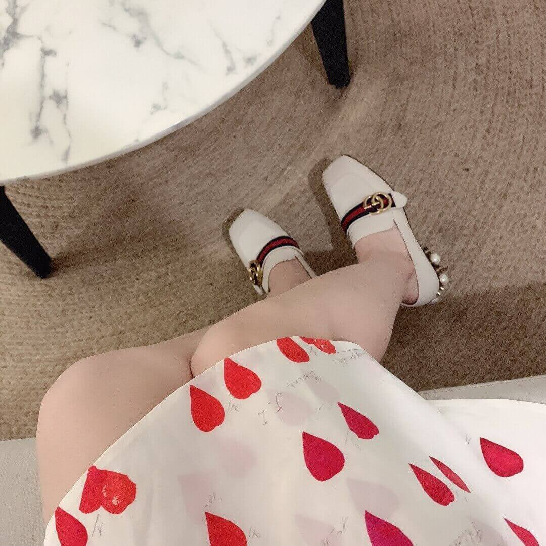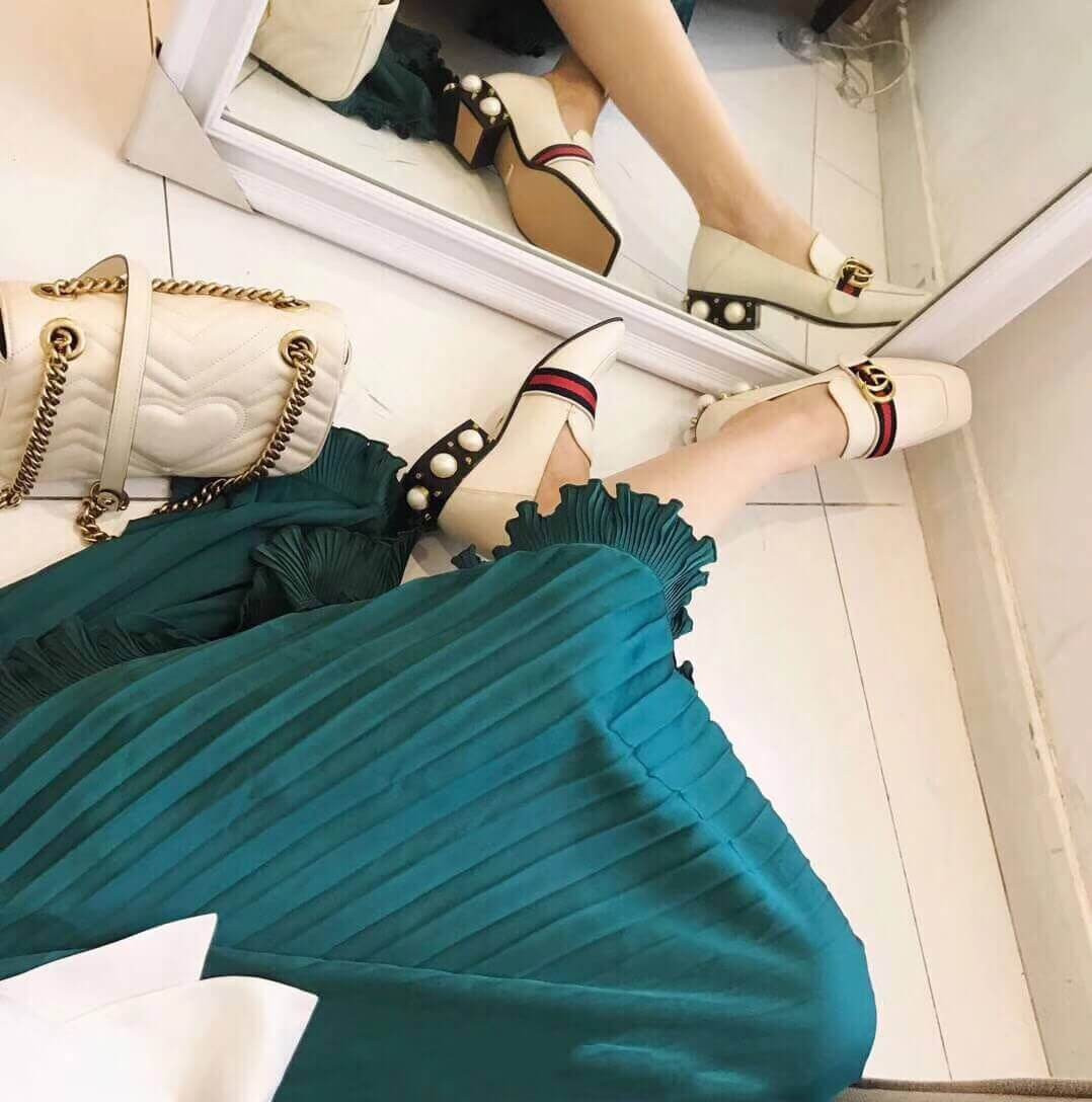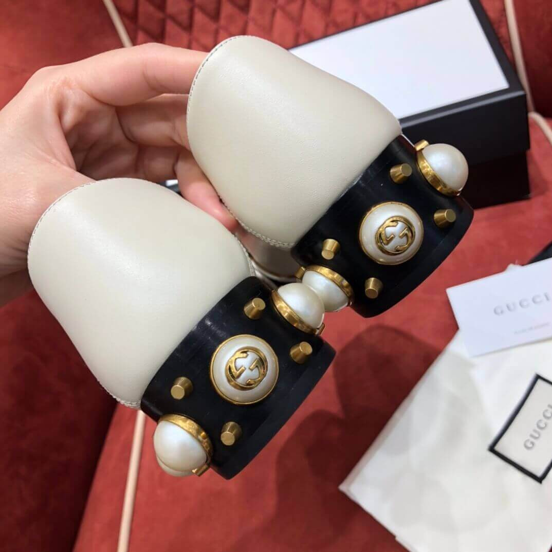 The Double G antique gold-toned hardware is set on a blue and red Web of these leather mid-heel loafers. The stacked heel has a row of GG pearls and studs and the back is designed to be worn with the heel folded down or up.