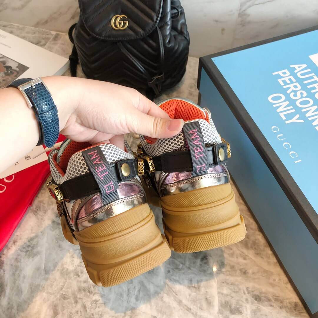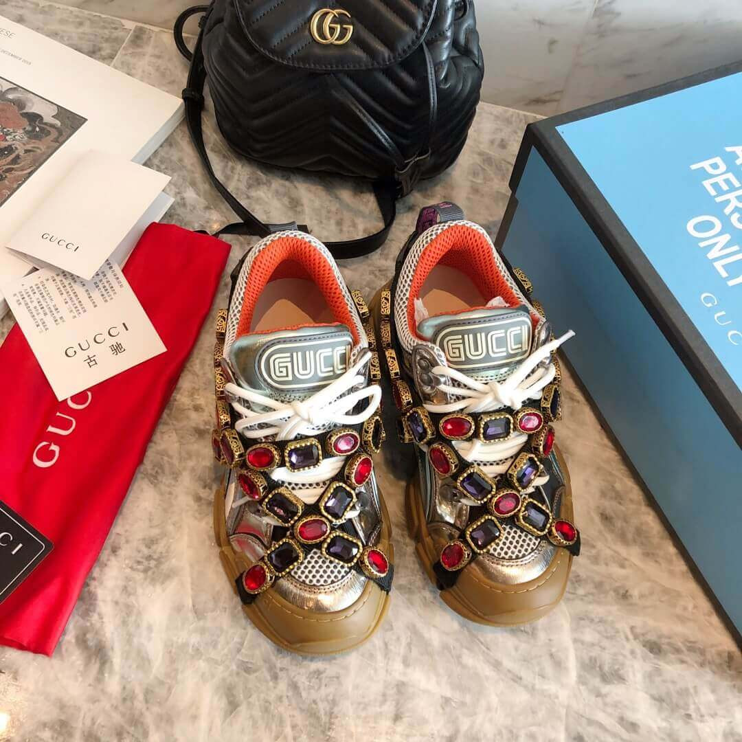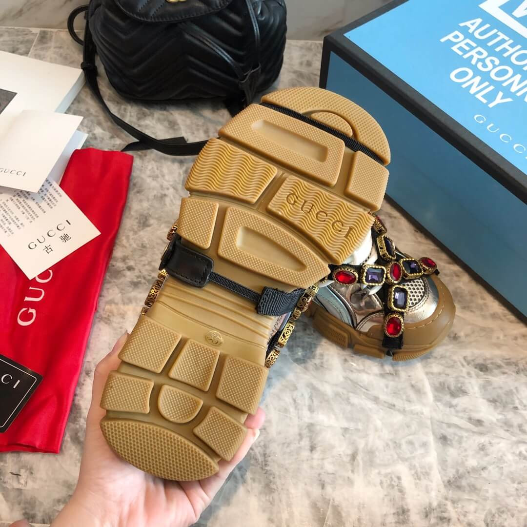 Inspired by the hiking world, this shoe line combines an oversize design with dream-like details. Crystals set in engraved metal casings have a vintage jewel effect, embroidered onto a removable elastic strap that wraps around the shoe. Featuring a mix of metallic leather, mesh and reflective fabric, the accessory is defined by the Gucci patch with the graphic font of SEGA.