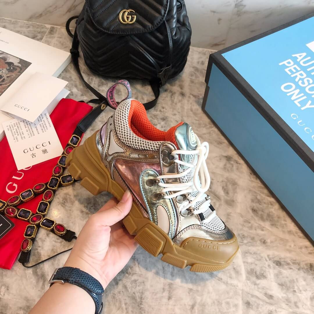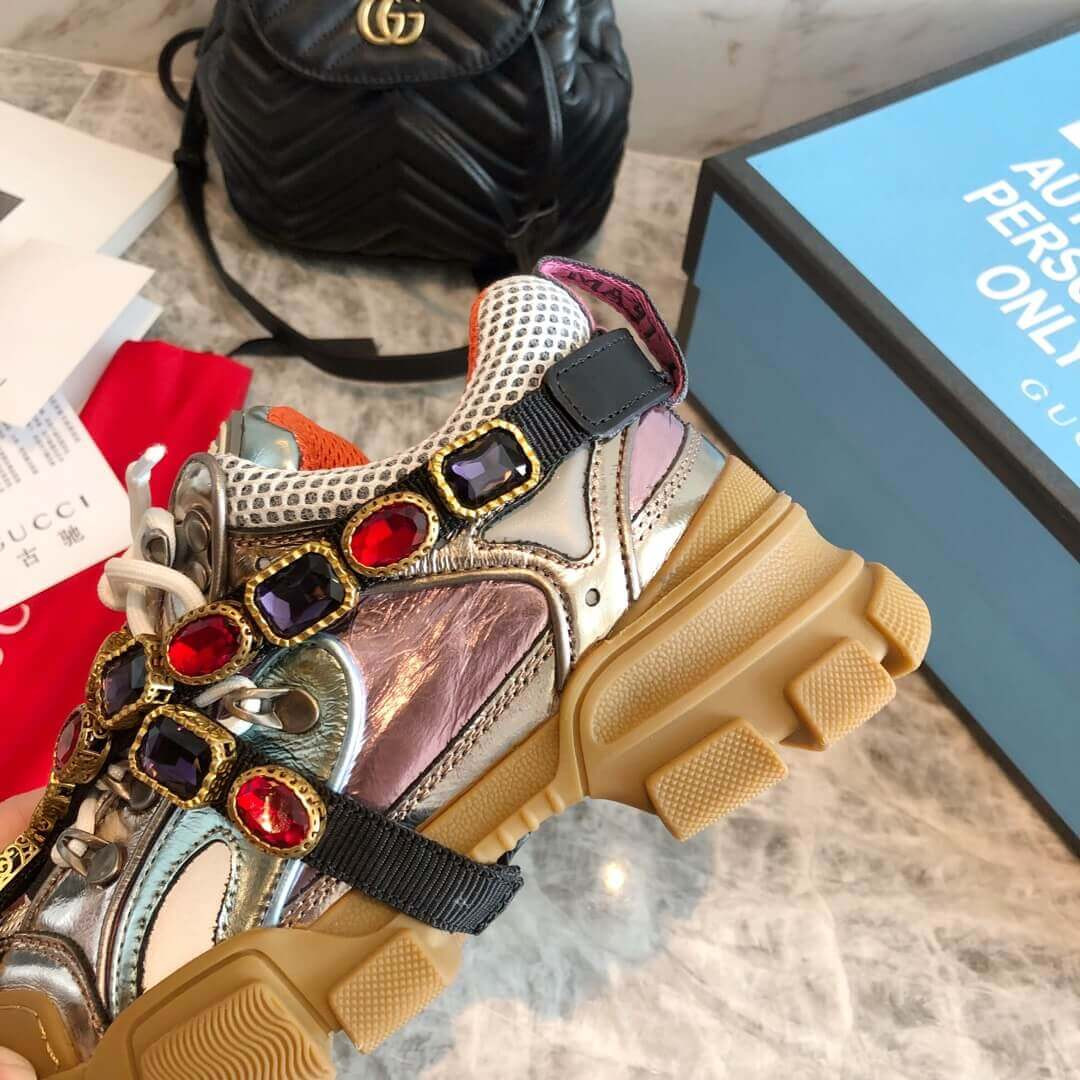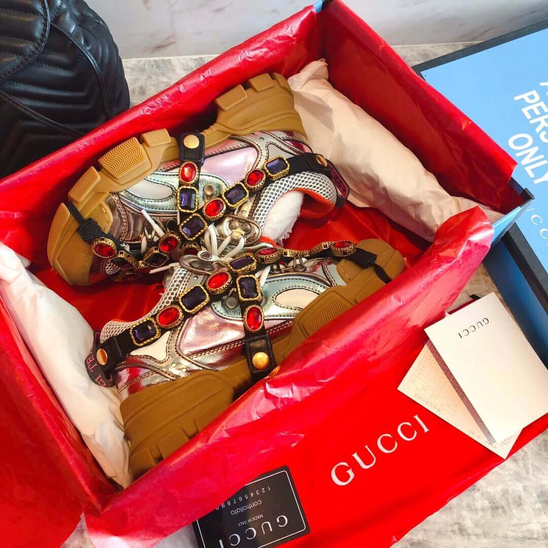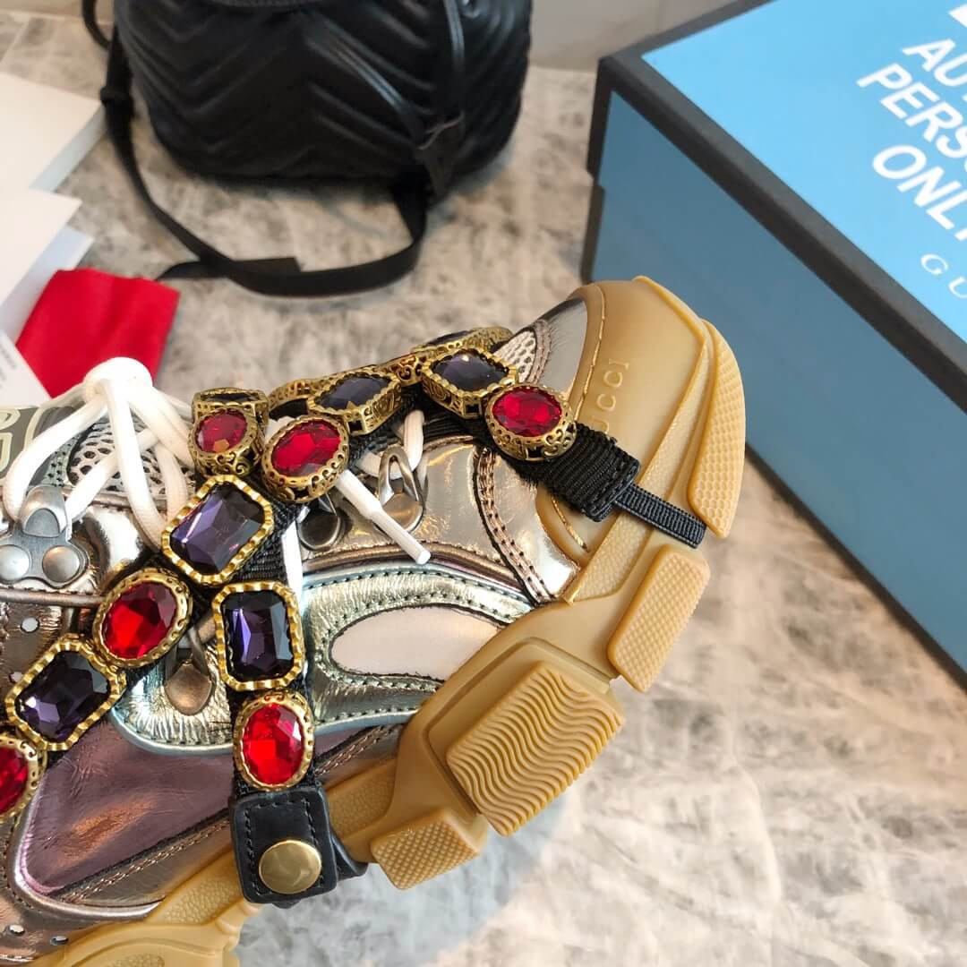 Inspired by the hiking world, this shoe line combines an oversize design with dream-like details. Crystals set in engraved metal casings have a vintage jewel effect, embroidered onto a removable elastic strap that wraps around the shoe. Featuring a mix of metallic leather, mesh and reflective fabric, the accessory is defined by the Gucci patch with the graphic font of SEGA.