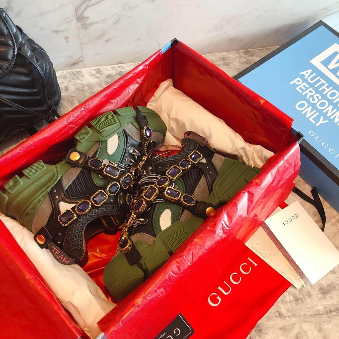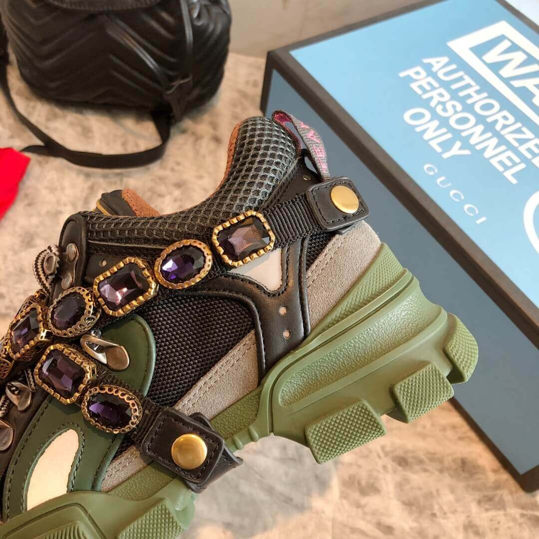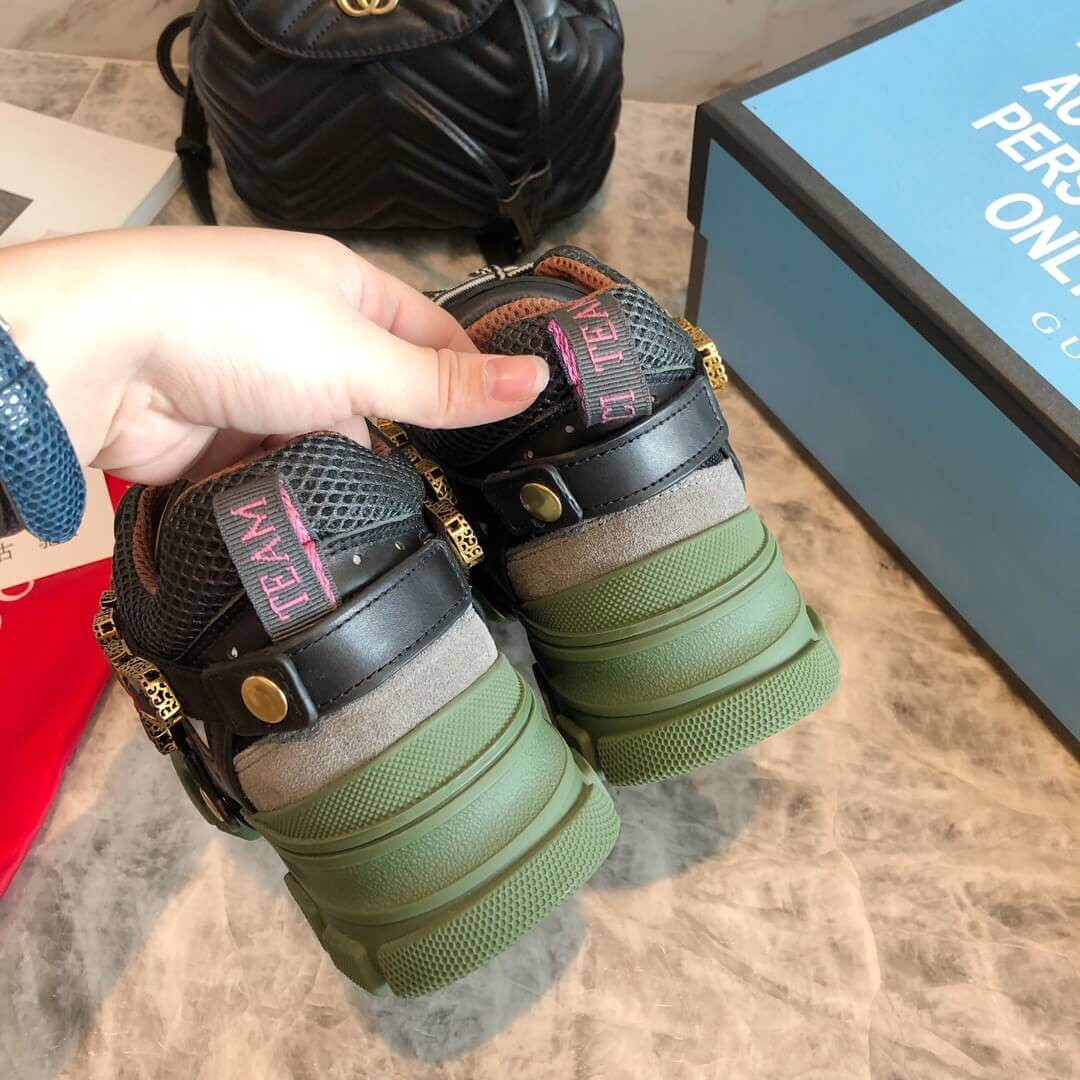 Inspired by the hiking world, this shoe line combines an oversize design with dream-like details. Crystals set in engraved metal casings have a vintage jewel effect, embroidered onto a removable elastic strap that wraps around the shoe. Featuring a mix of metallic leather, mesh and reflective fabric, the accessory is defined by the Gucci patch with the graphic font of SEGA.