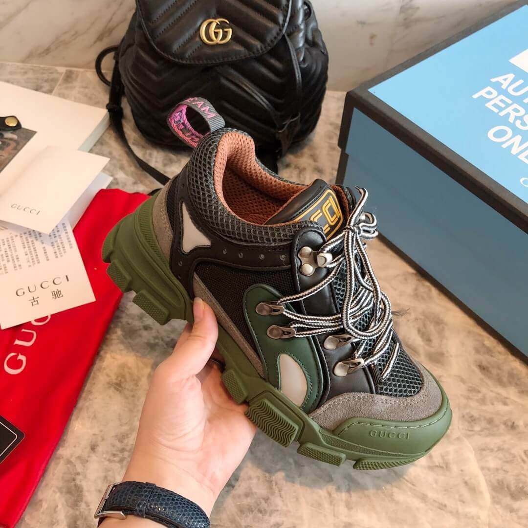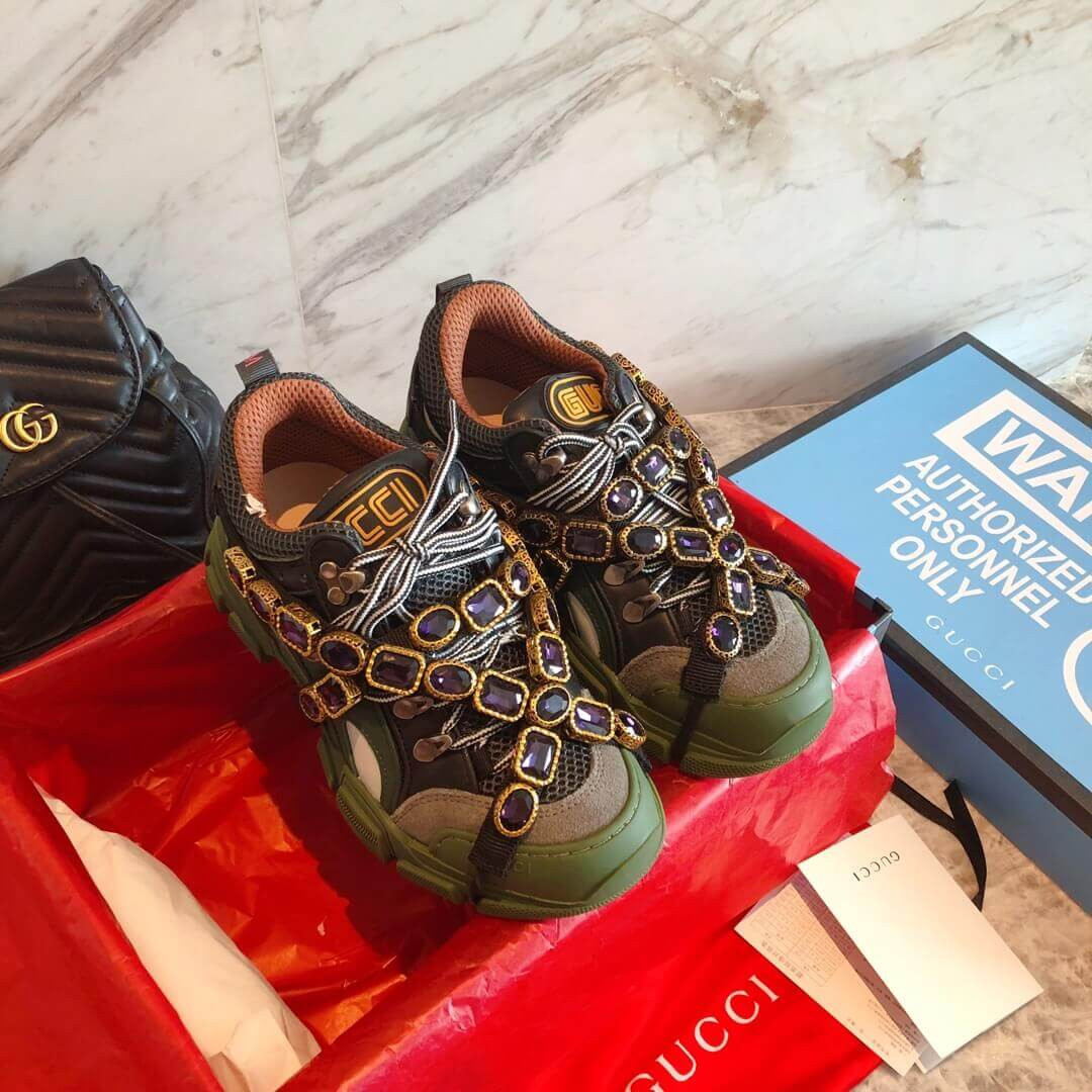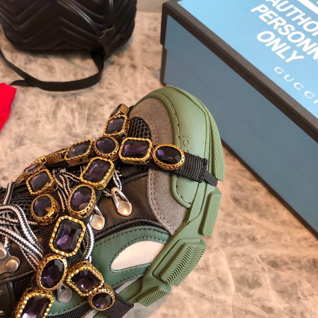 Inspired by the hiking world, this shoe line combines an oversize design with dream-like details. Crystals set in engraved metal casings have a vintage jewel effect, embroidered onto a removable elastic strap that wraps around the shoe. Featuring a mix of metallic leather, mesh and reflective fabric, the accessory is defined by the Gucci patch with the graphic font of SEGA.